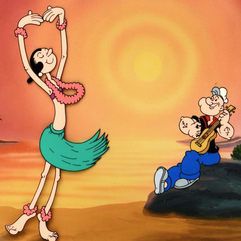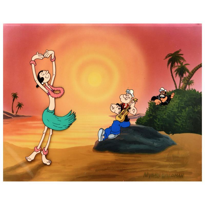 "Dancing on the Beach" is a limited edition hand inked and hand painted animation cel with background, numbered and hand signed by Myron Waldman (1908-2006). Measures approximately 14" x 12" (background), 10" x 8" (cel).