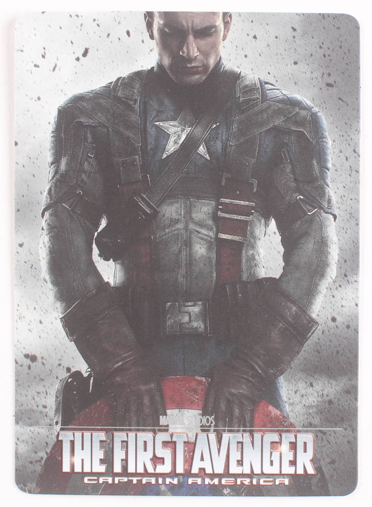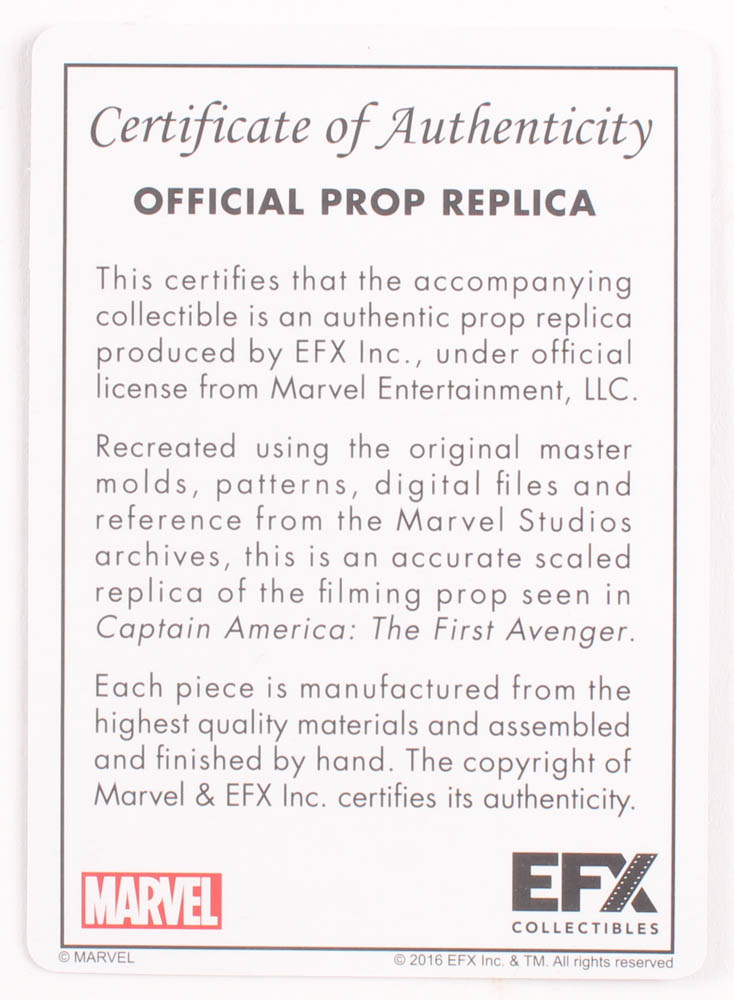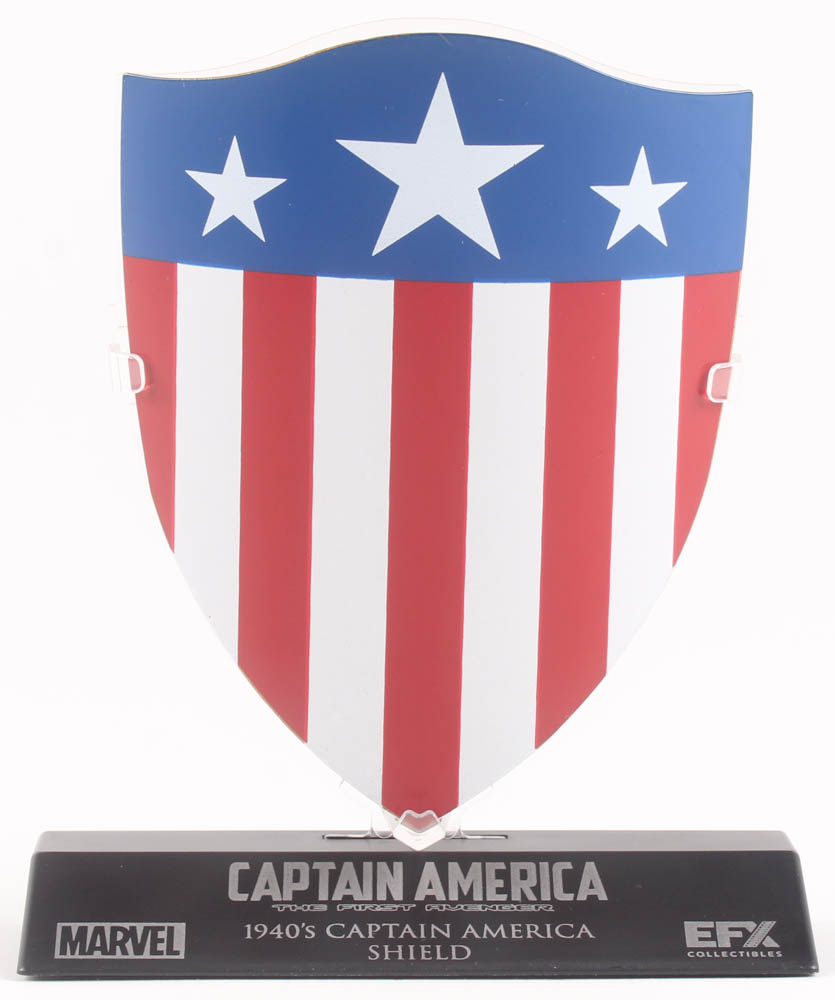 Captain America: The First Avenger movie prop replica Shield. The prop is made of metal and measures 4.5" in height. The display base is included as shown.