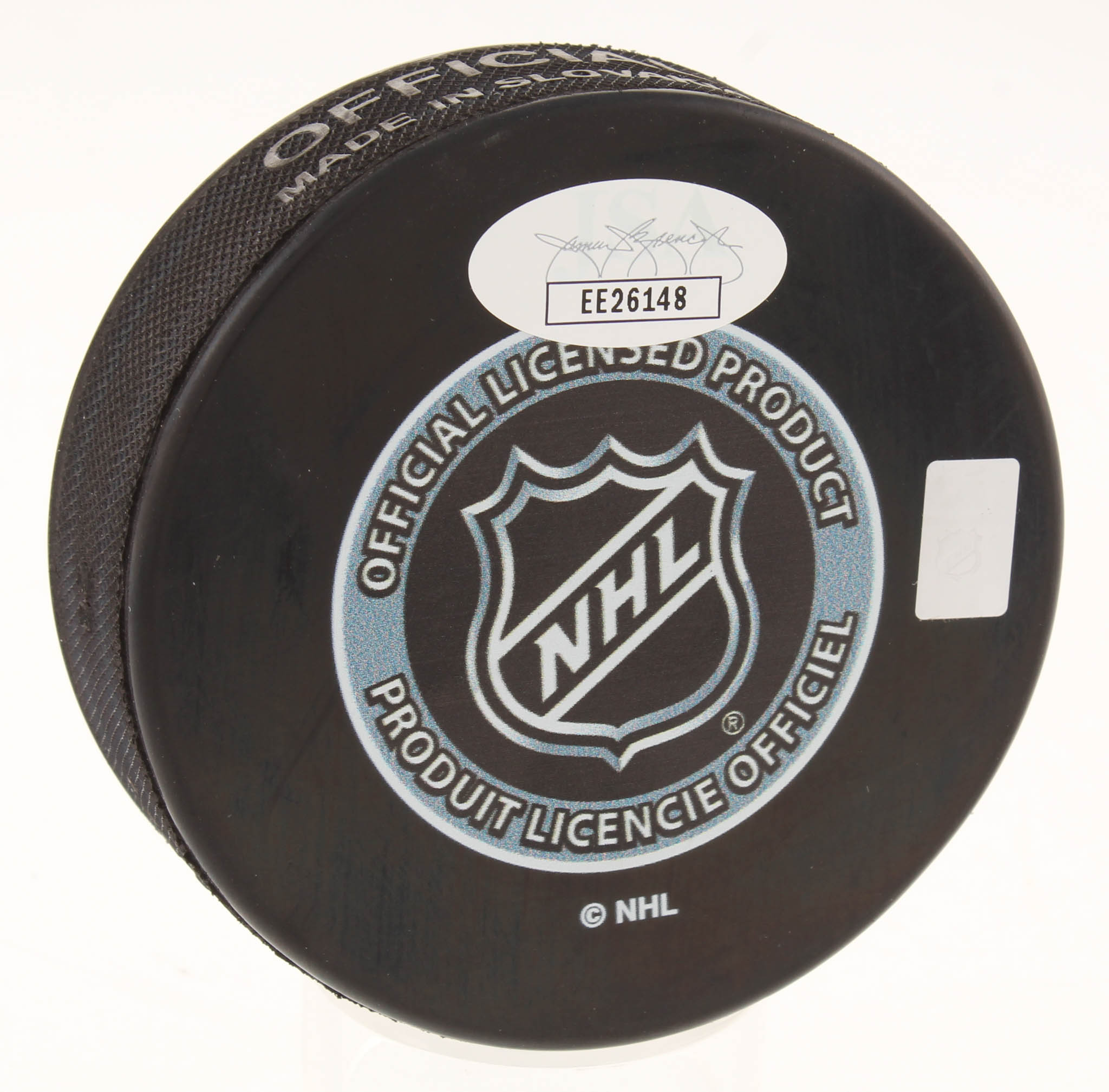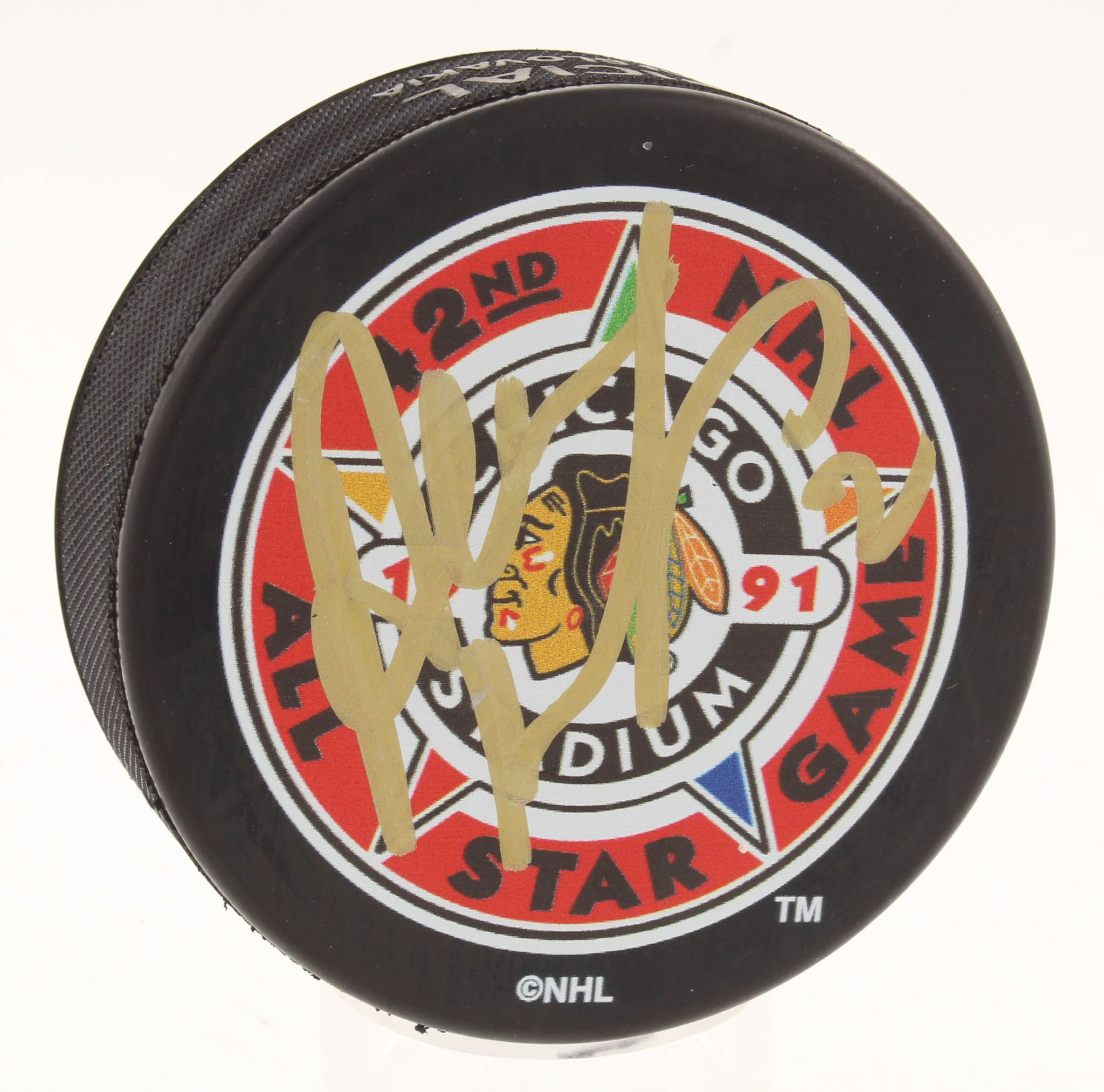1991 NHL All-Star Game hockey puck. Hand-signed in gold paint pen by Al MacInnis (HOF).