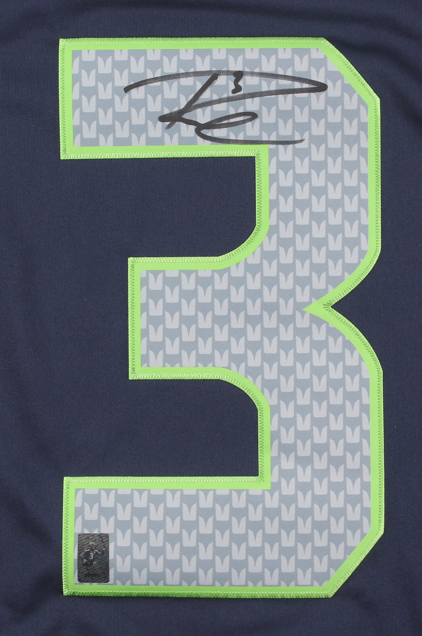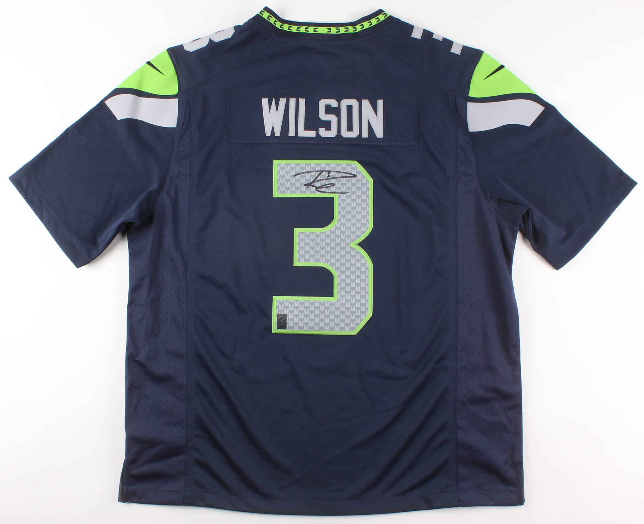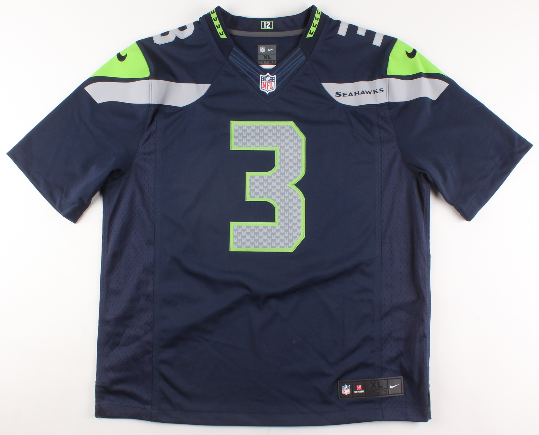 Authentic On Field Nike jersey. Everything is sewn on, XL. Jersey is new with tags. Hand-signed in black felt tip pen by Russell Wilson.
