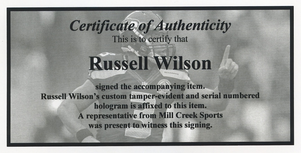 The autograph includes an official Russell Wilson hologram and COA from Mill Creek Sports for authenticity purposes. Also includes an official JSA hologram and matching LOA.