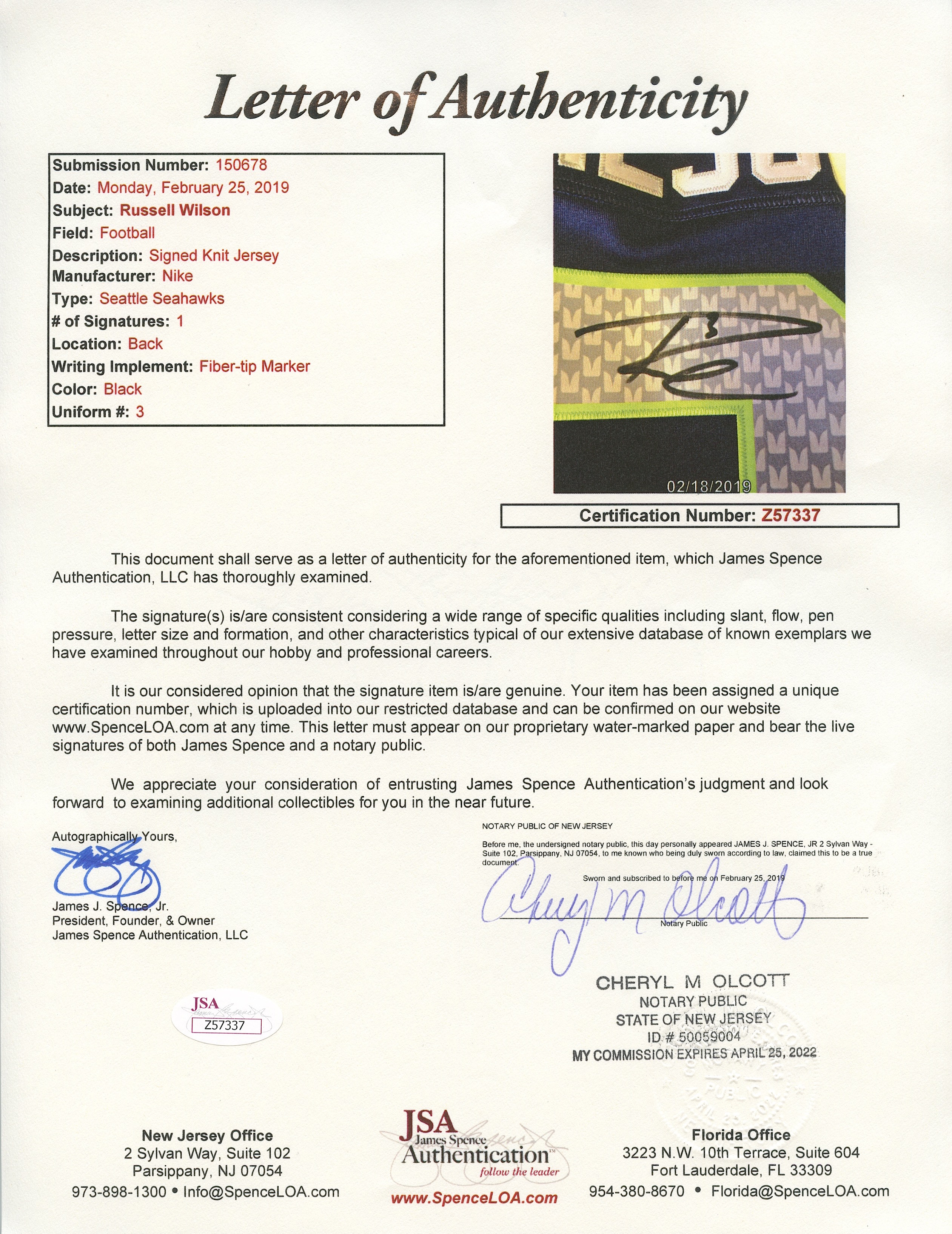 Authentication: Russell Wilson COA & JSA COA