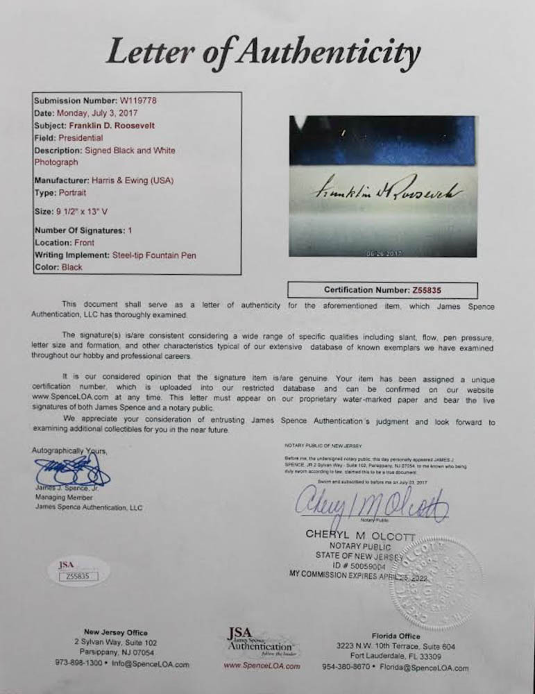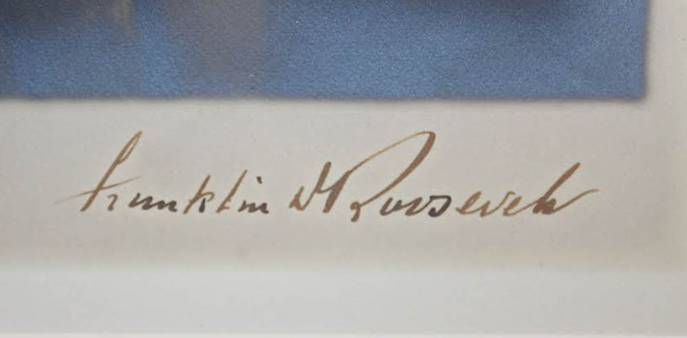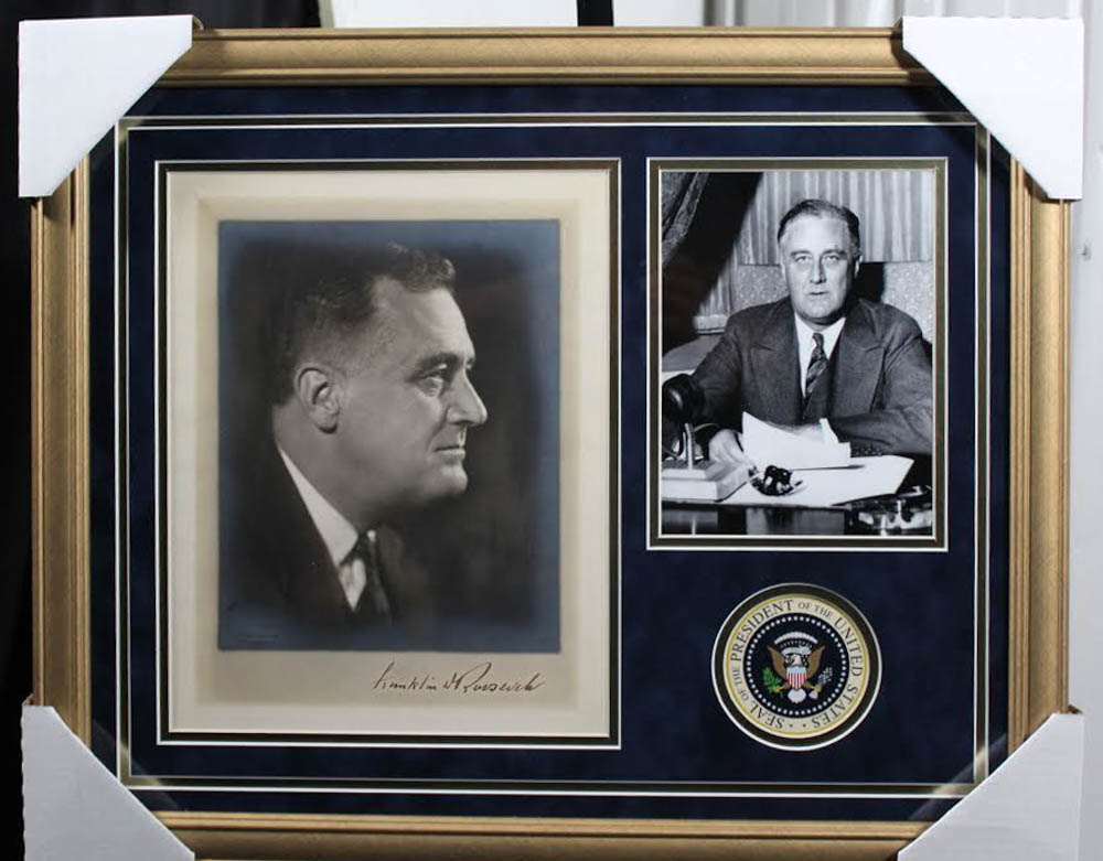 Custom frame measures 17" x 21" in size and features a photo that has been hand-signed in black ink pen by Franklin D. Roosevelt (D. 1945).