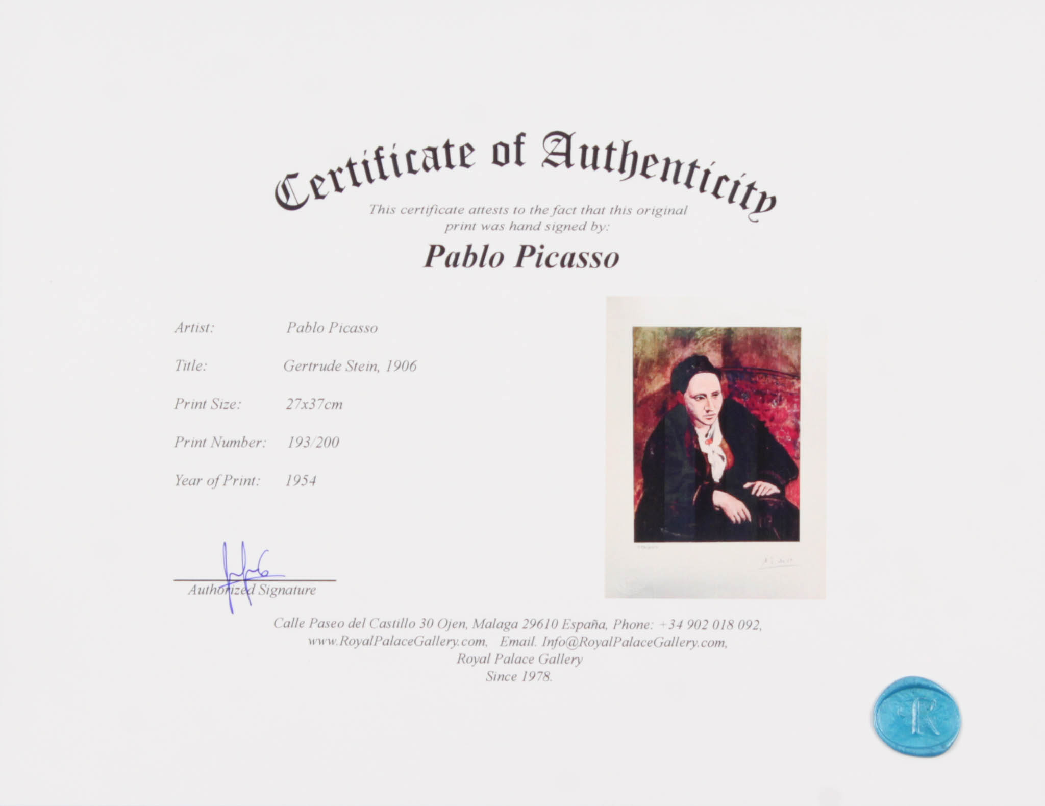 Pablo Picasso Signed "Gertrude Stein" LE 11.75x14.5 Original Lithograph Print (Royal Palace COA)