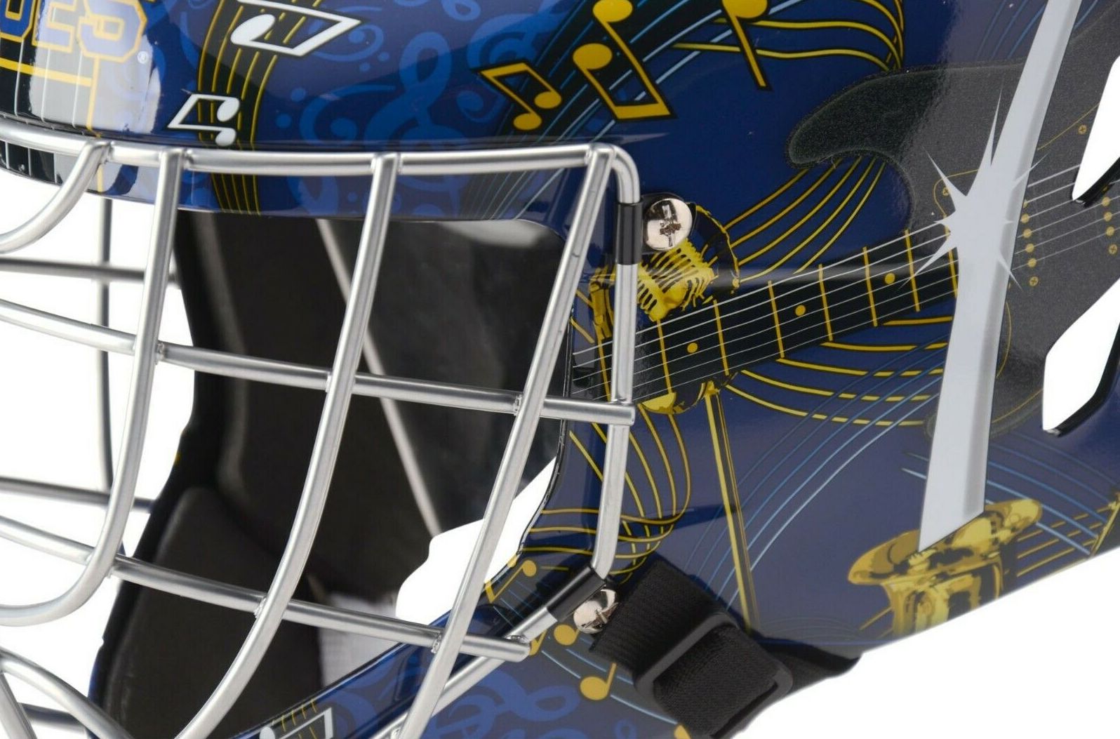 St. Louis Blues full-size goalie mask. Hand-signed and inscribed in blue felt-tip pen by Jordan Binnington. The mask is a limited edition and has been hand-numbered #/50.