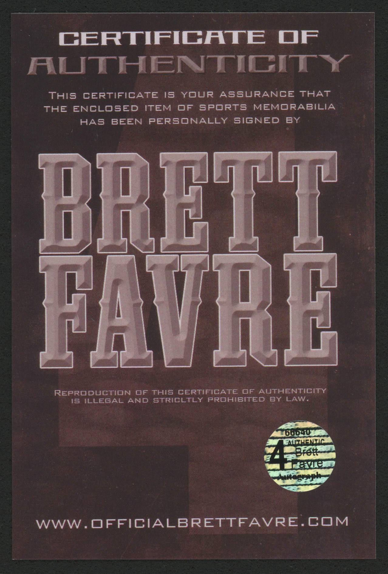 The lot / autograph(s) includes an official Brett Favre player hologram and matching COA as well as an official James Spence Authentication (JSA) hologram and matching COA for authenticity purposes. Also includes a proof photo from the signing.