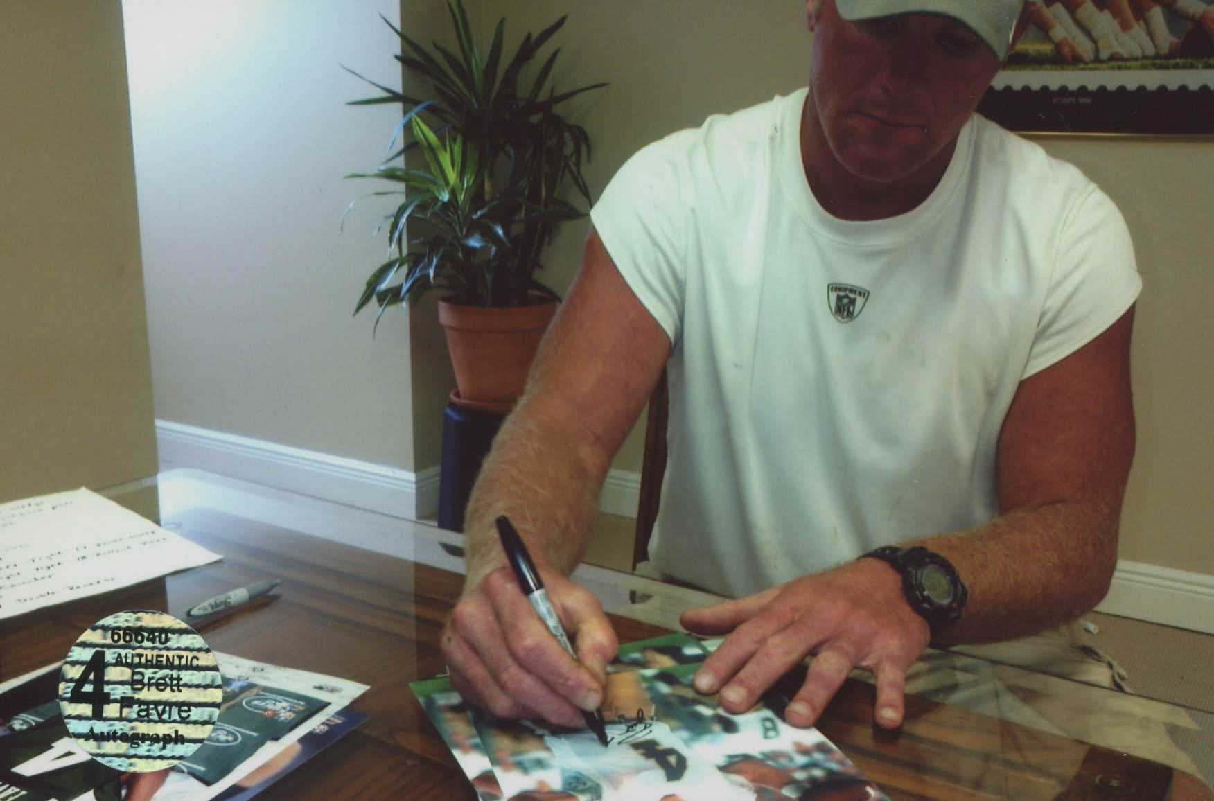 Photo measures 8" x 10" in size and has been hand-signed in black felt-tip pen by Brett Favre (HOF).