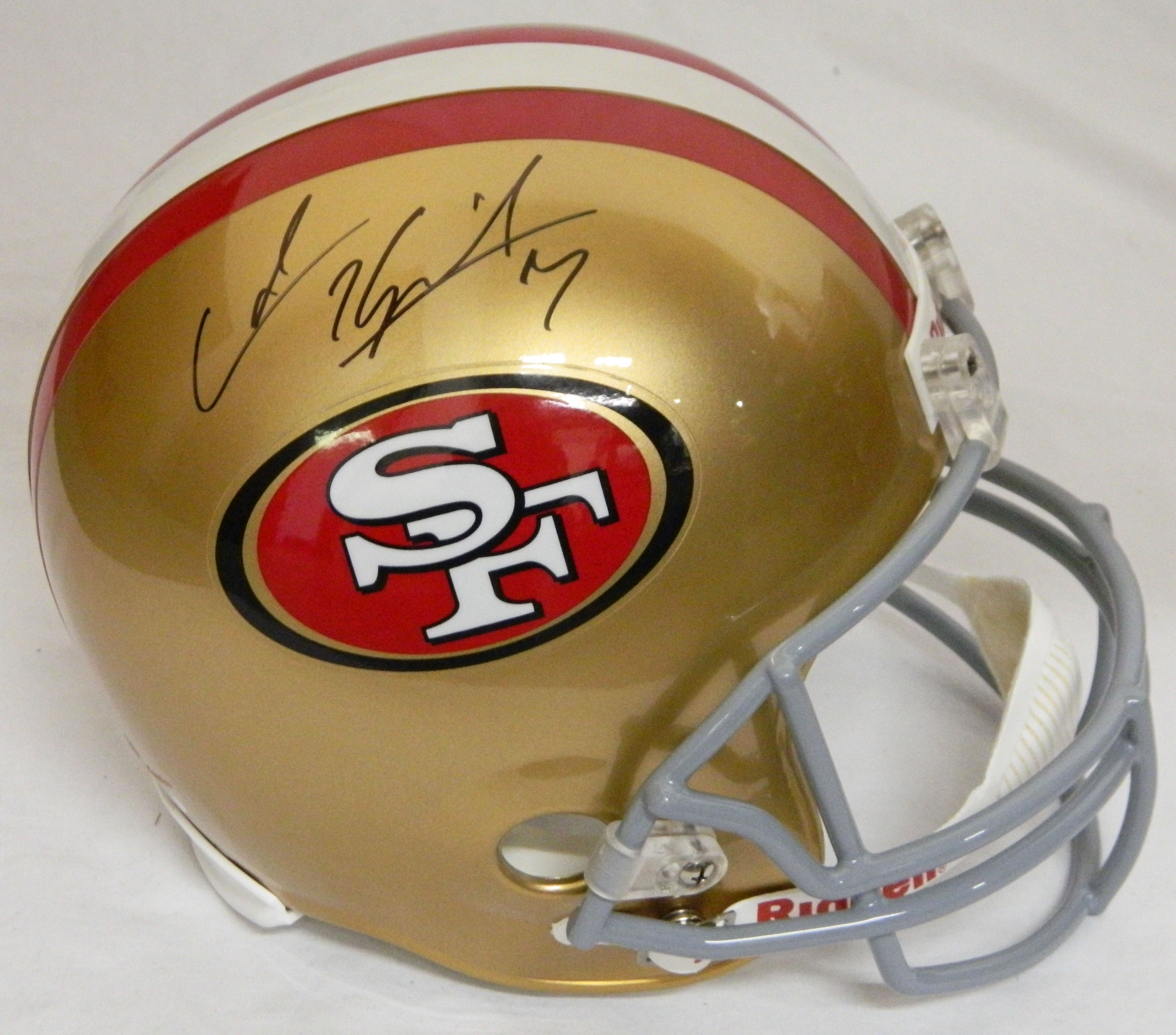 San Francisco 49ers Riddell full-size replica helmet hand-signed in black felt tip pen by Colin Kaepernick. The autograph includes an official Schwartz Sports Hologram and matching COA for authenticity purposes.