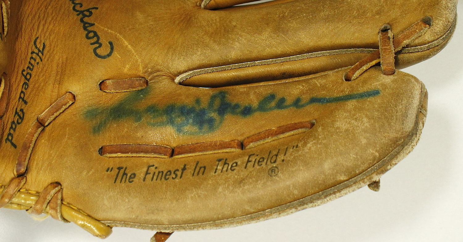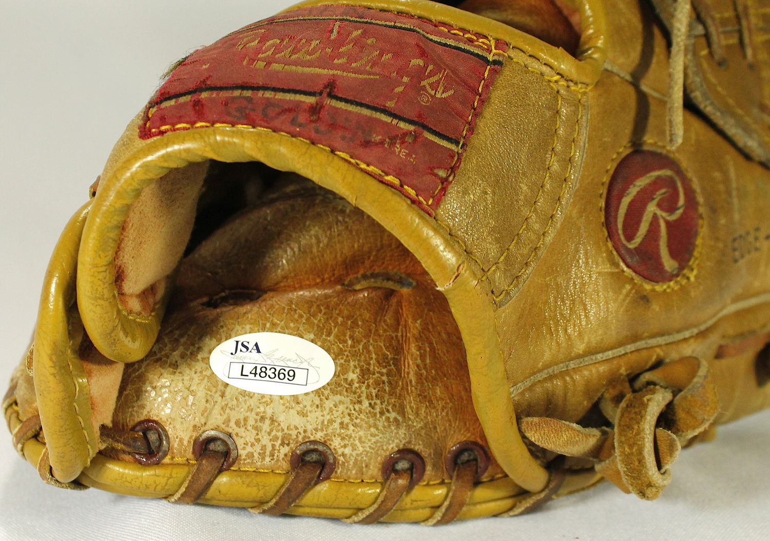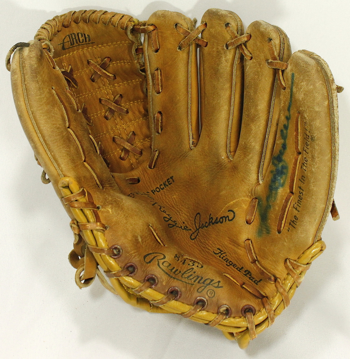 Rawlings 8435 Baseball Glove. Hand-signed in blue felt-tip by Reggie Jackson (Athletics HOF). Includes proof picture of the signing. The autograph includes an official James Spence Authentication (JSA) hologram and matching COA for authenticity purposes.