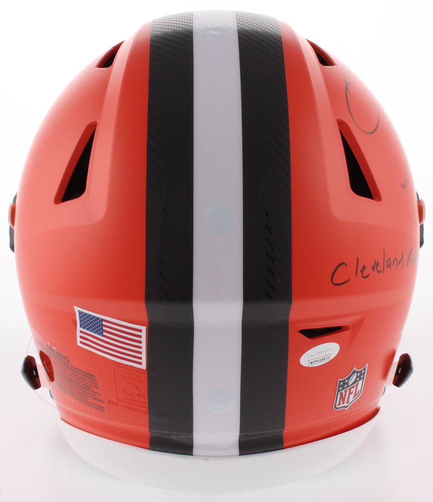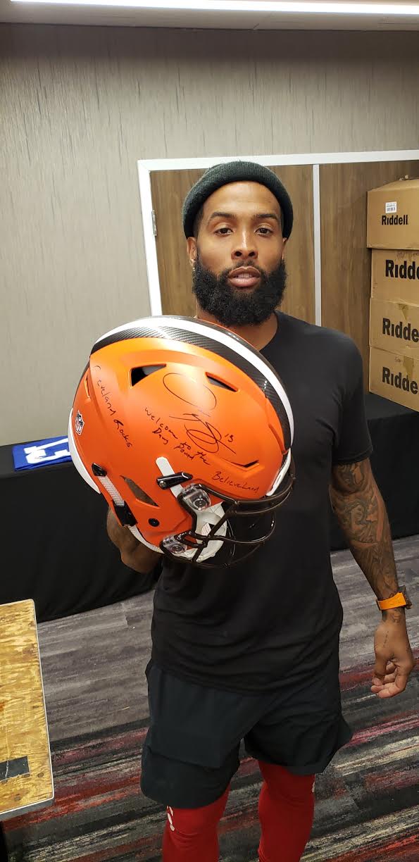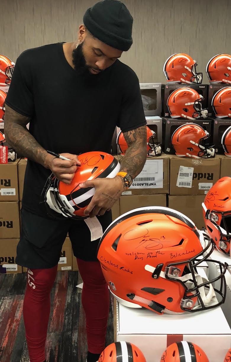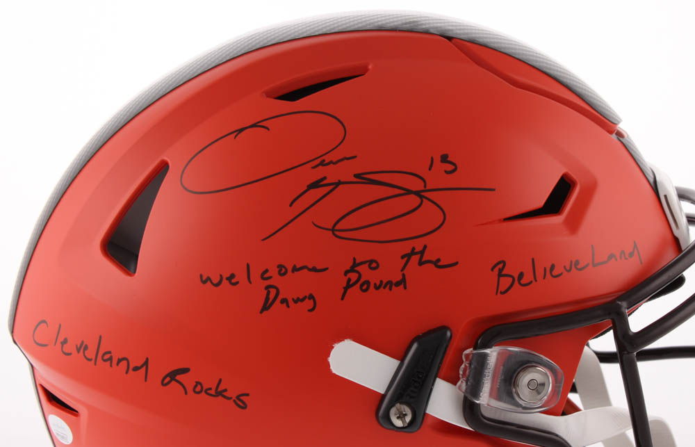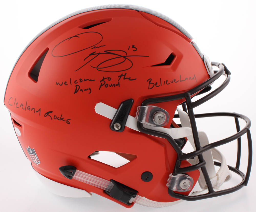Riddell Cleveland Browns Full-Size Authentic On-Field speed flex helmet. Hand-signed in black felt-tip pen by Odell Beckham Jr.