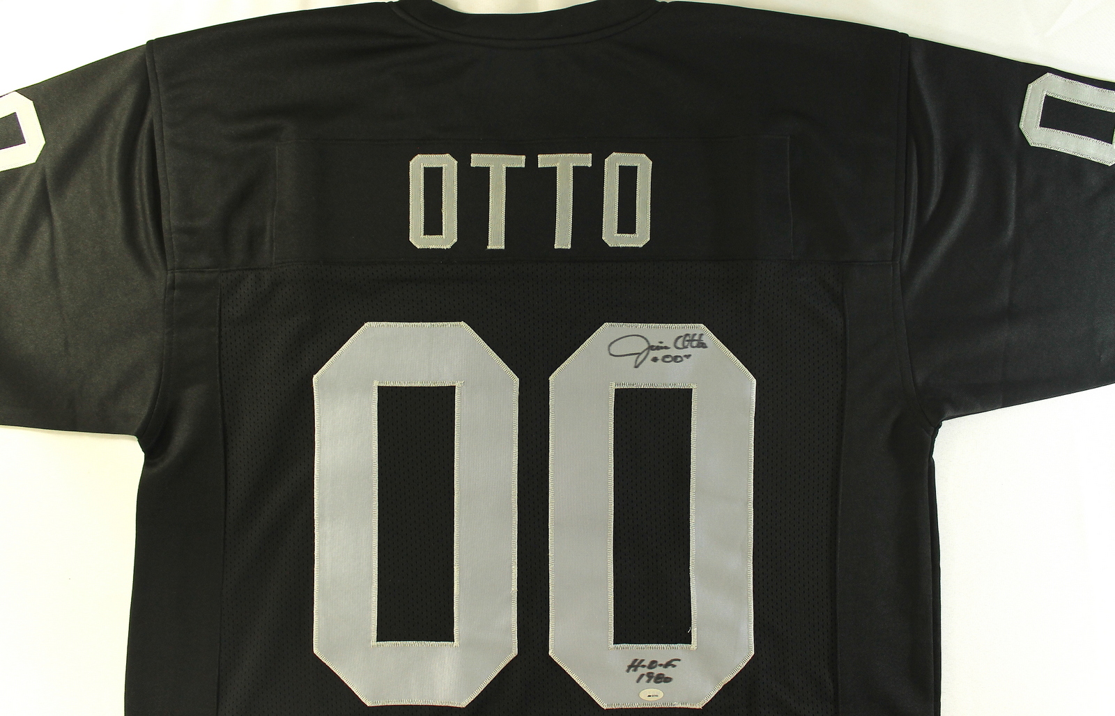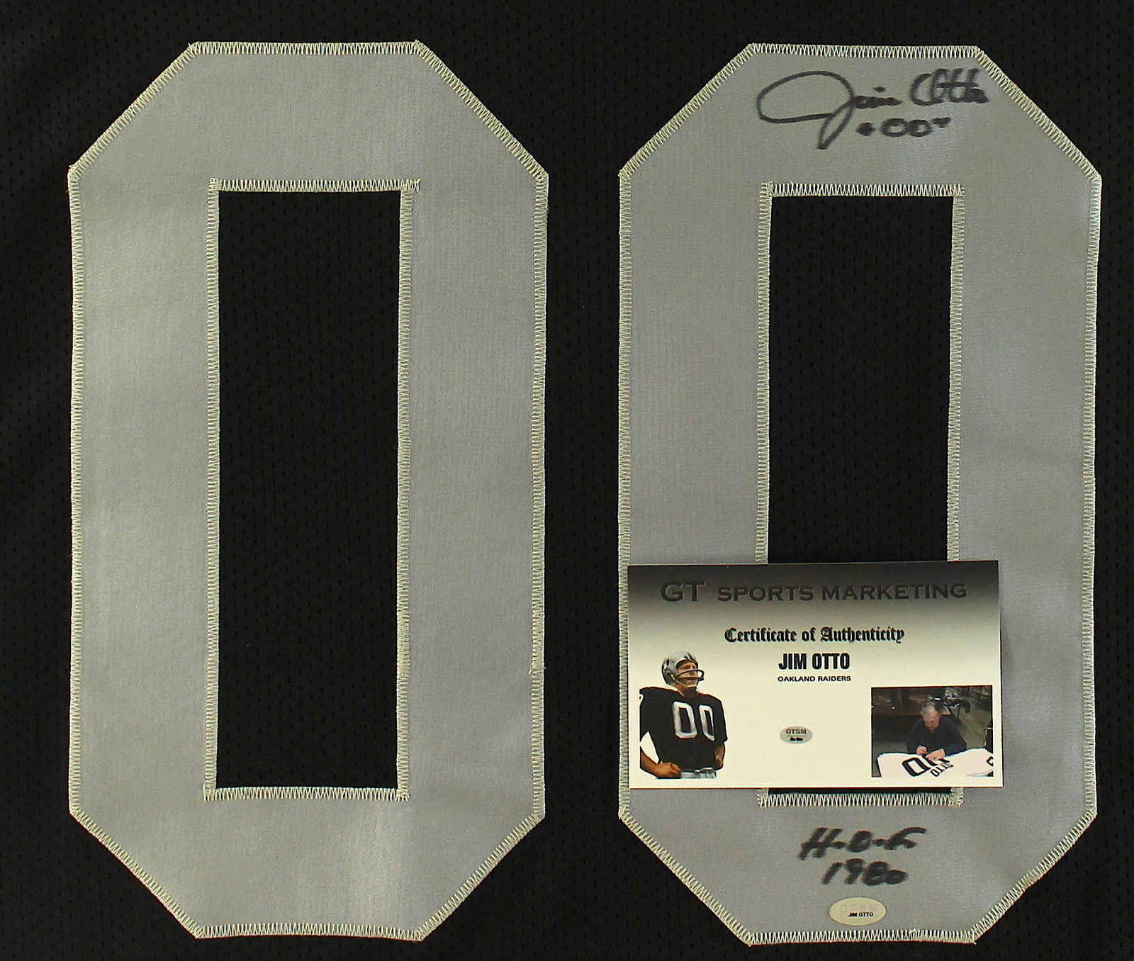Custom on-field style jersey. Everything is sewn on, size XL. Hand-signed and inscribed in black felt tip pen by Jim Otto (Raiders HOF). Autograph includes an official Jim Otto hologram and matching COA from GTSM for authenticity purposes.