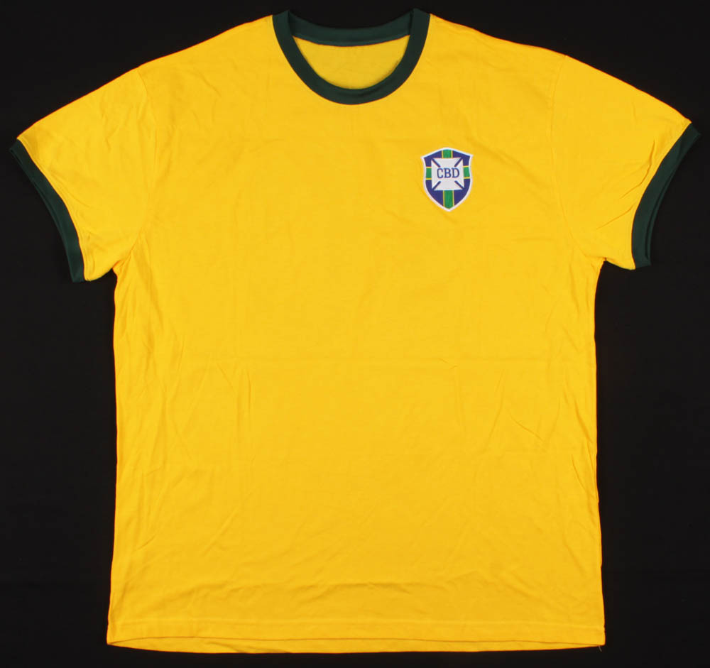 Custom on-field style jersey. Everything sewn on, size XL. Hand-signed in silver paint pen by Pele.