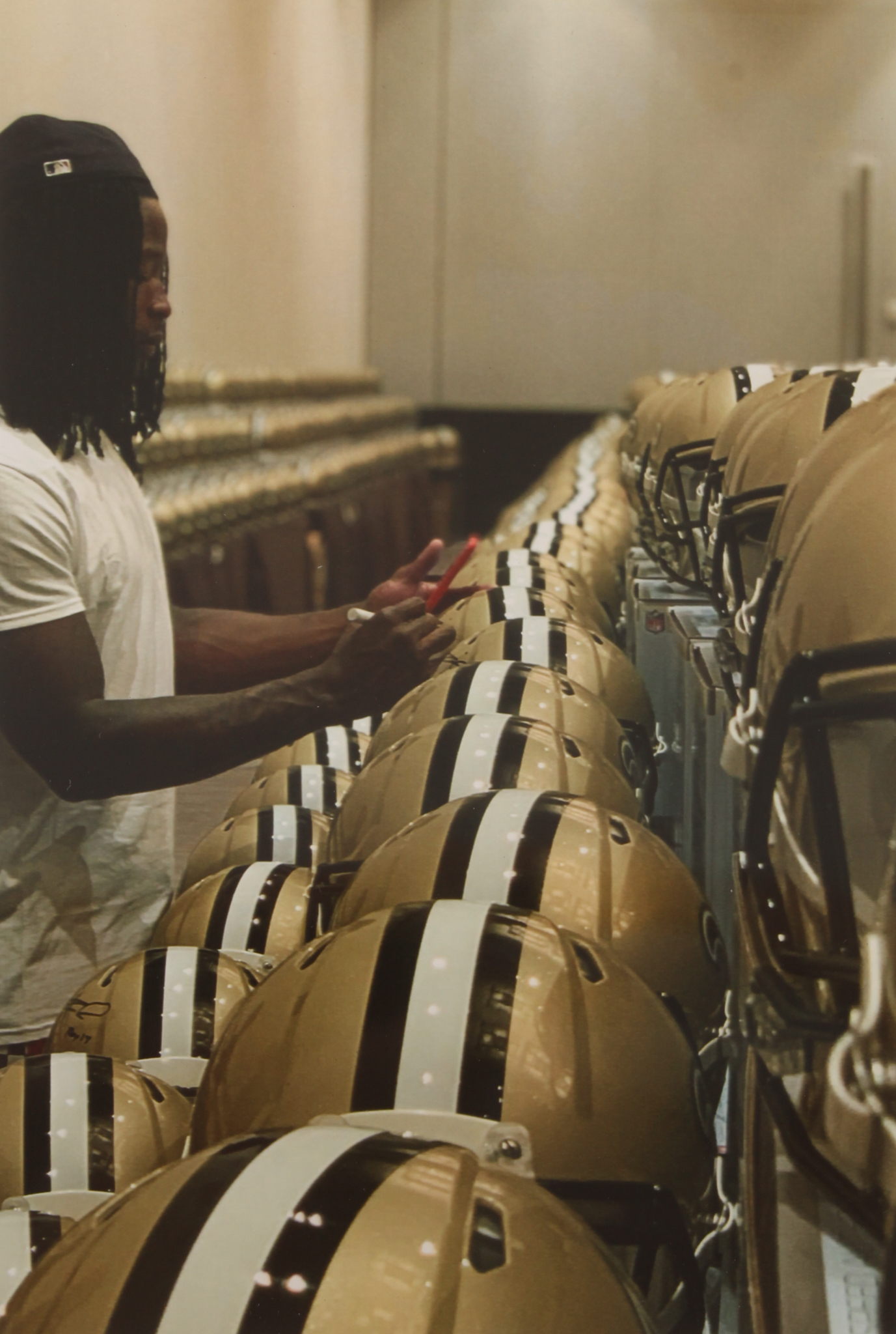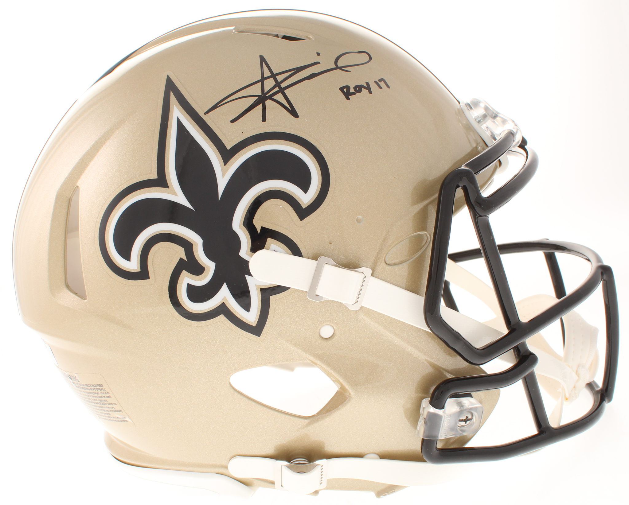 Riddell New Orleans Saints full-size authentic on-field speed helmet. Hand-signed in black felt-tip pen by Alvin Kamara.