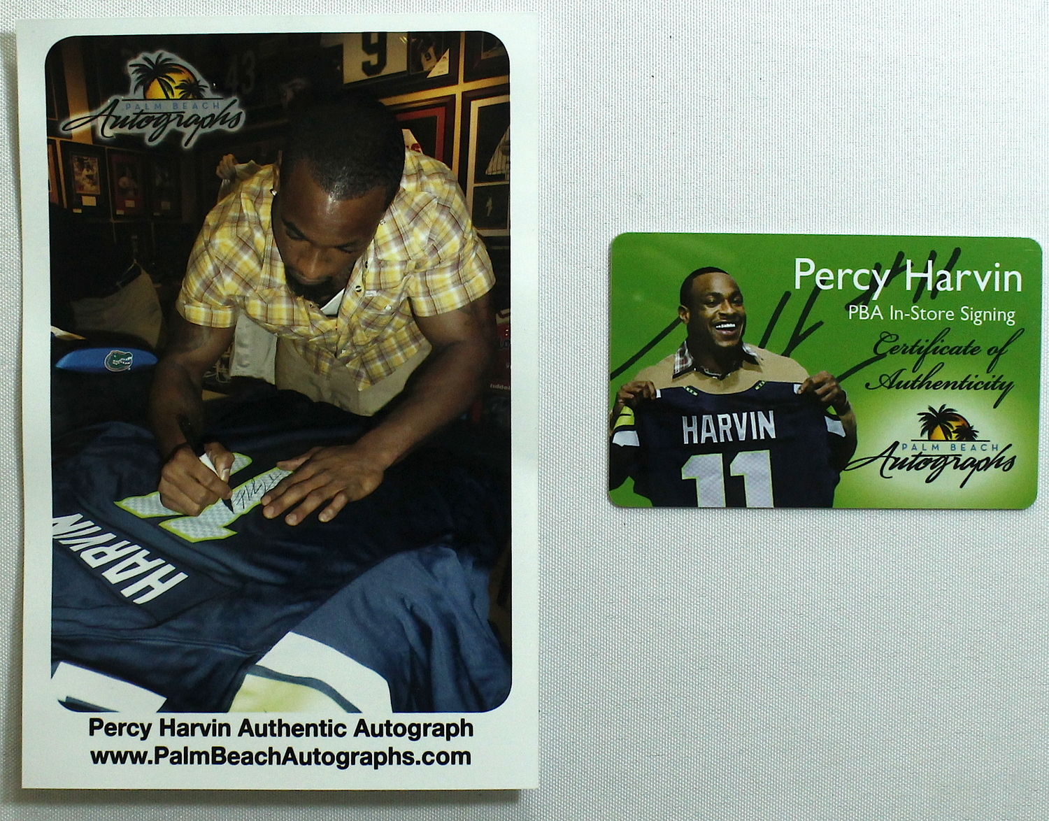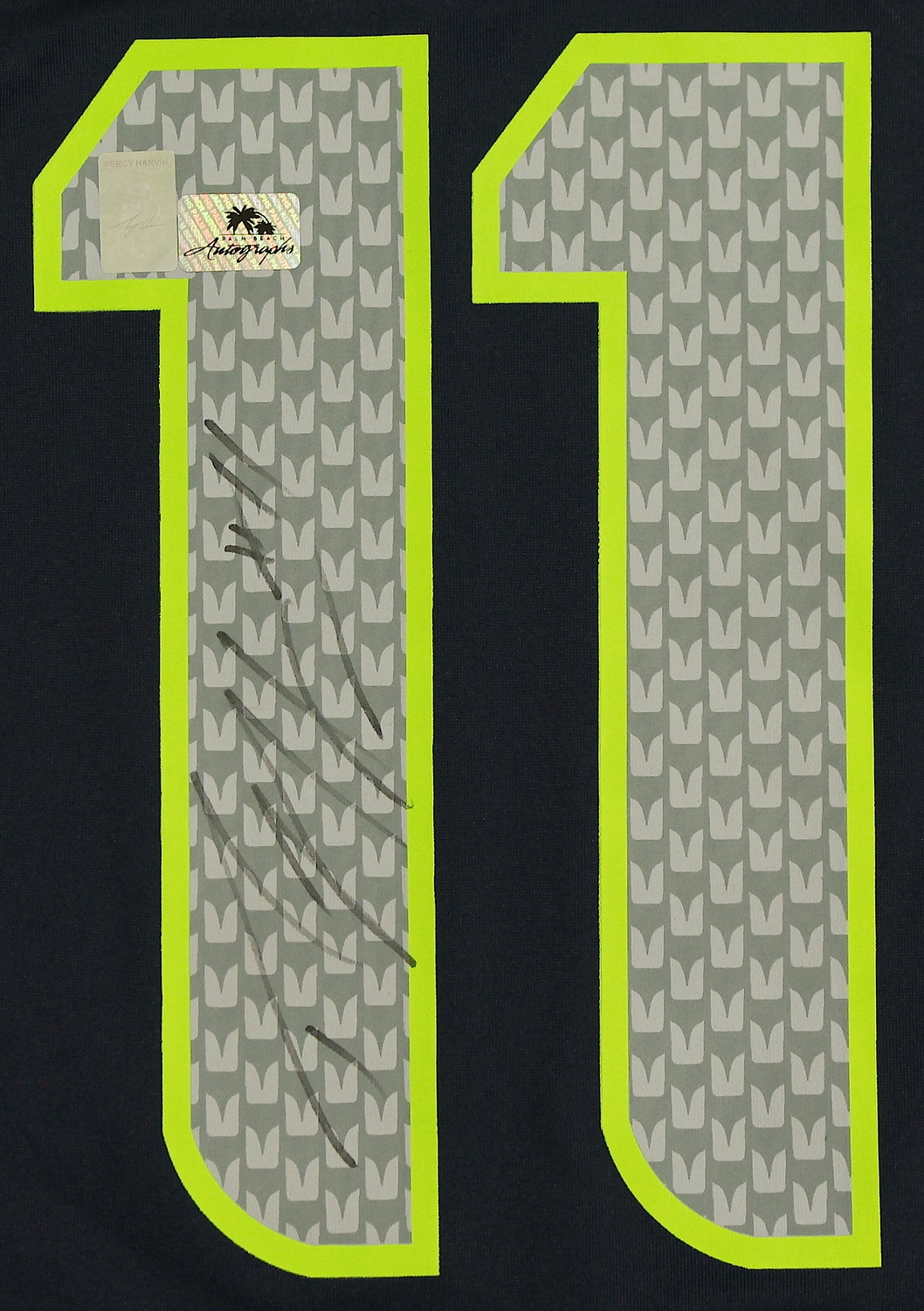 Nike on-field style jersey. Everything is printed on, size XL. Hand-signed in black felt-tip pen by Percy Harvin (Seahawks). Includes a proof picture of the signing. The autograph includes an official Palm Beach Autographs hologram and matching COA for authenticity purposes.