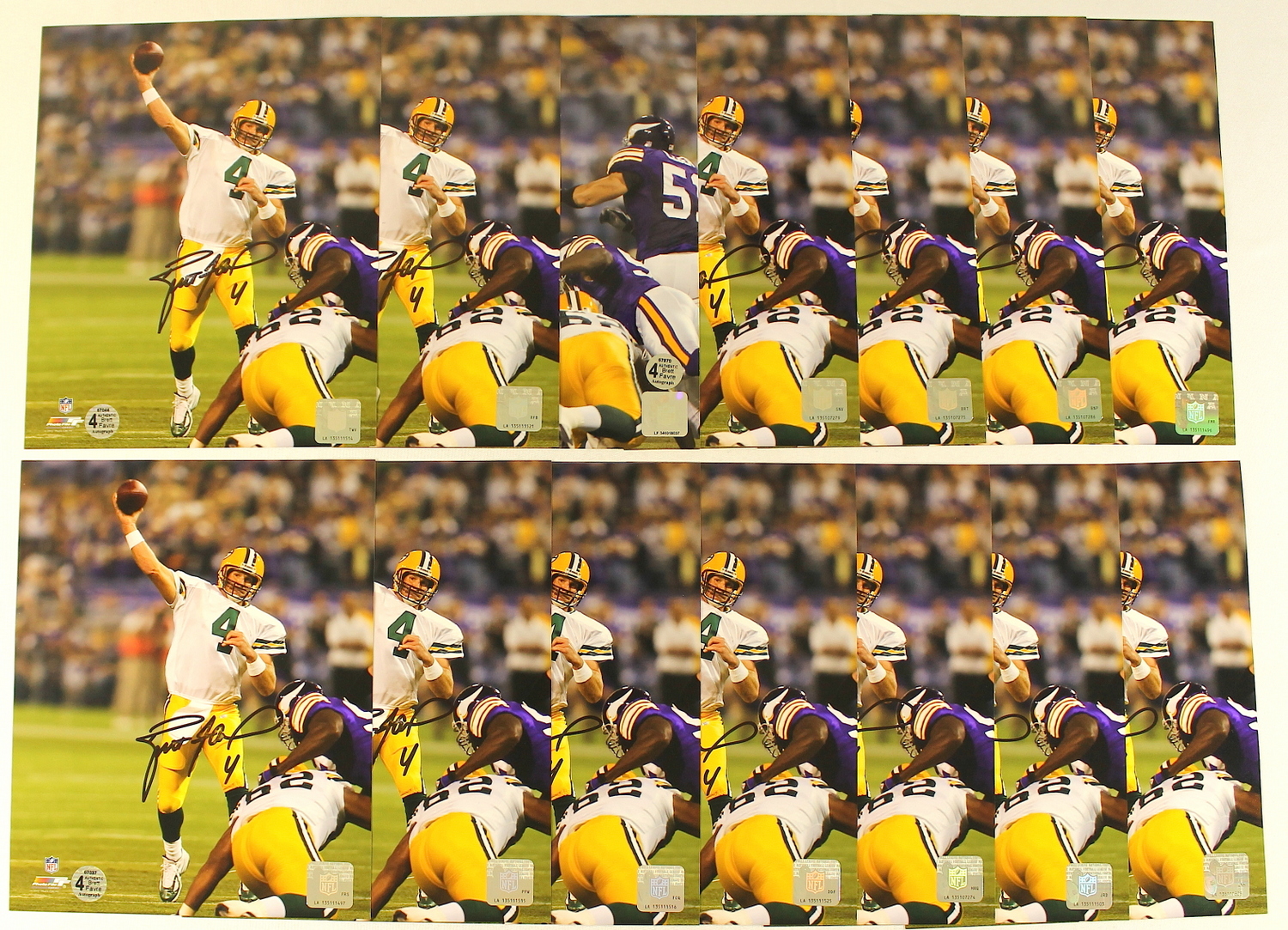 Lot of (14) 8" x 10" photos hand-signed in black felt-tip pen by Brett Favre (Packers, Jets, Vikings). Each photo includes an official Brett Favre hologram and matching COA for authenticity purposes.
