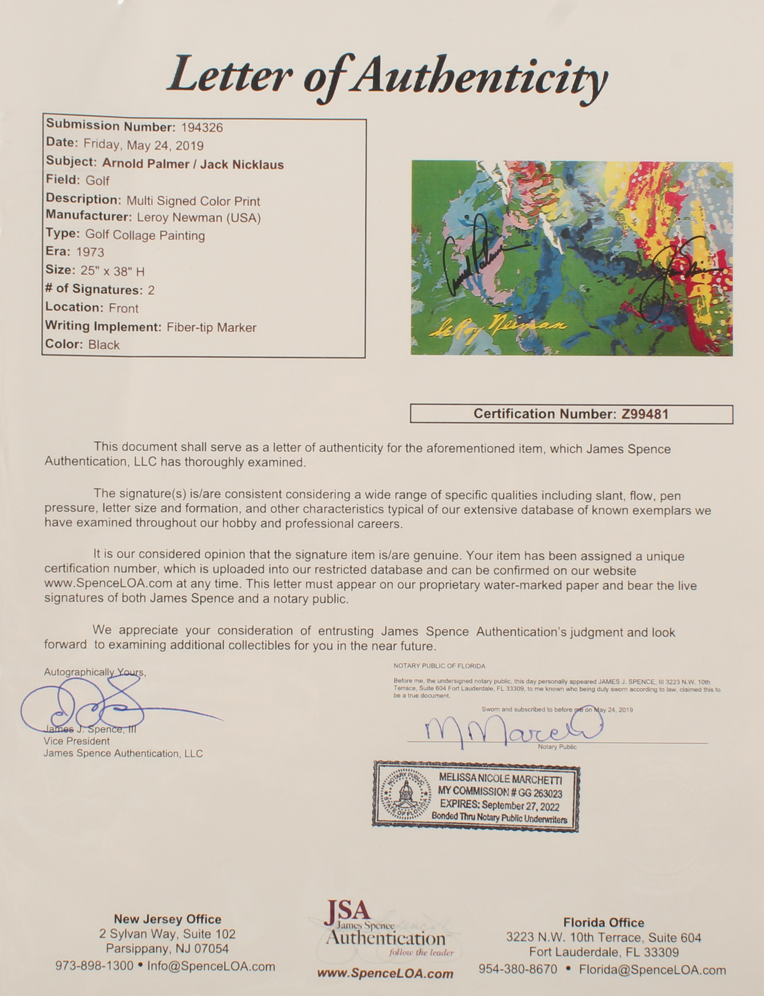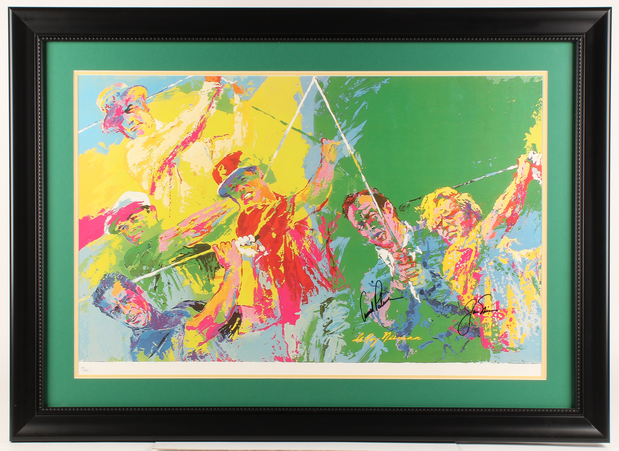 Custom frame measures 29" x 40" in size. Features a Leroy Neiman print that has been hand-signed in black felt-tip pen by Arnold Palmer and Jack Nicklaus.