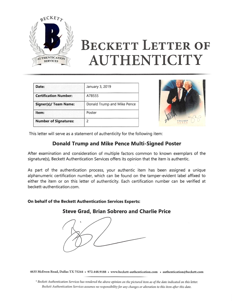 The lot / autograph(s) includes an official Beckett Authentication Services hologram and matching LOA for authenticity purposes.