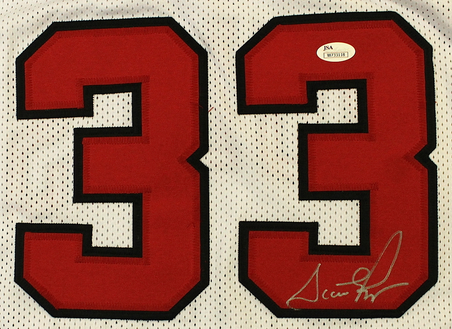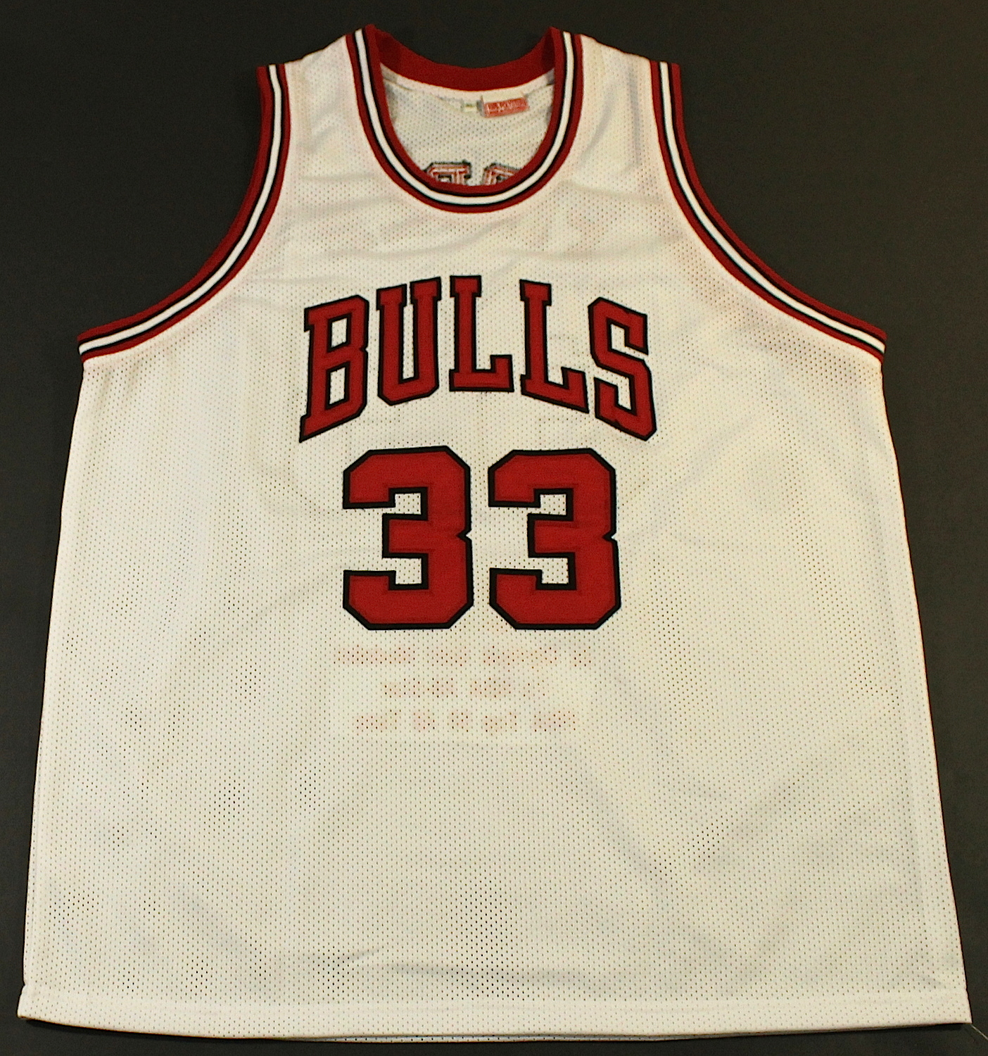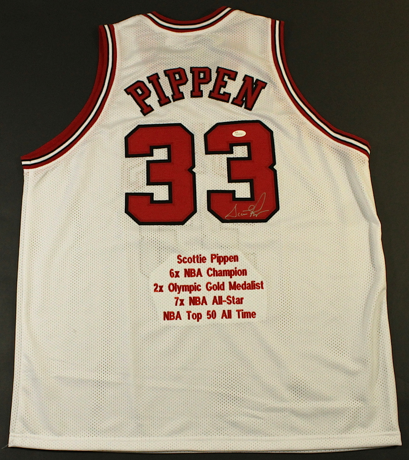 Custom on-court style jersey. Everything is sewn on, size XL. Hand-signed in silver paint pen by Scottie Pippen (Bulls, HOF). Pippen's career stats are custom stitched into the jersey below the reverse numbers. The autograph includes an official James Spence Authentication (JSA) hologram and matching COA for authenticity purposes. The signing of this item was witnessed by JSA.