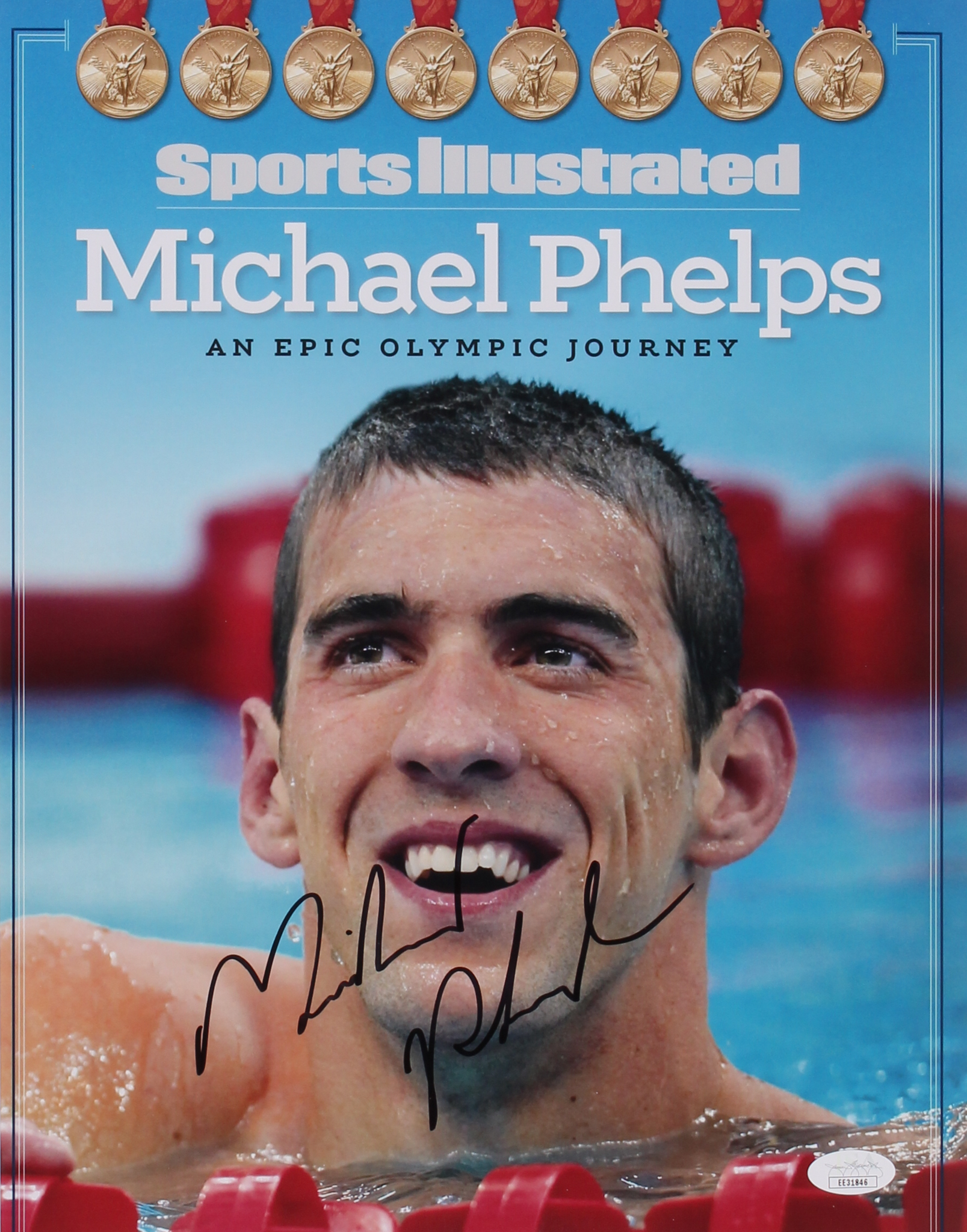 Photo measures 11" x 14" in size and has been hand-signed in black felt-tip pen by Michael Phelps.