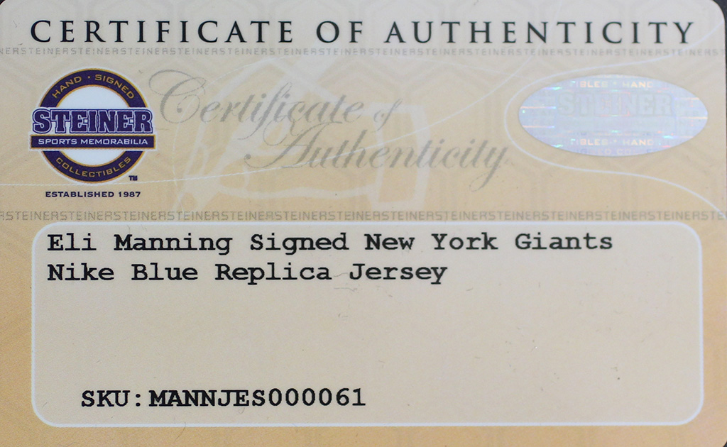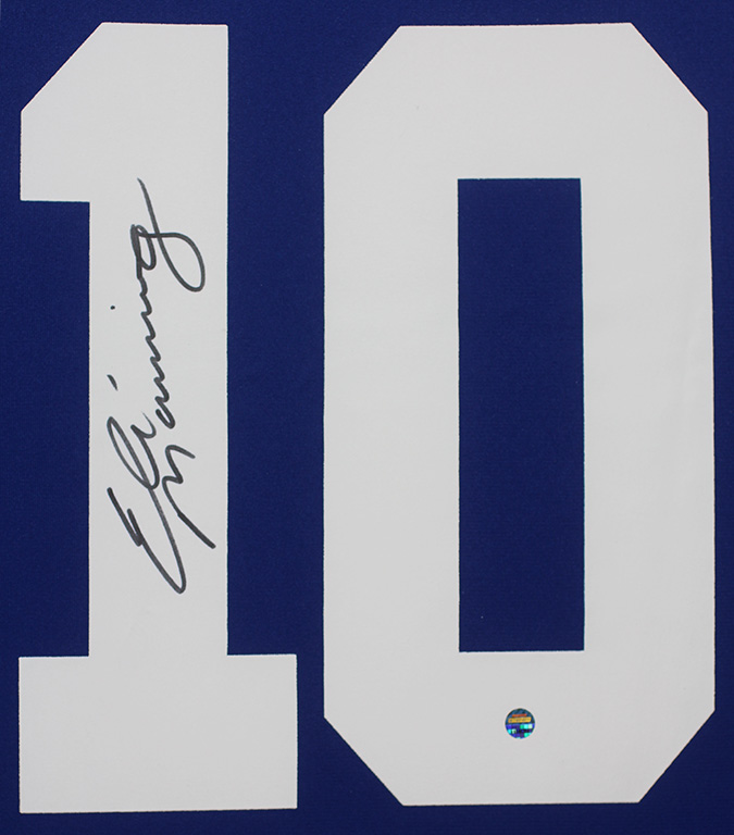 A beautifully framed autographed Eli Manning Jersey. The autograph is certified by Steiner Sports and includes a sticker on the Jersey and a matching certificate attached to the back of the frame.