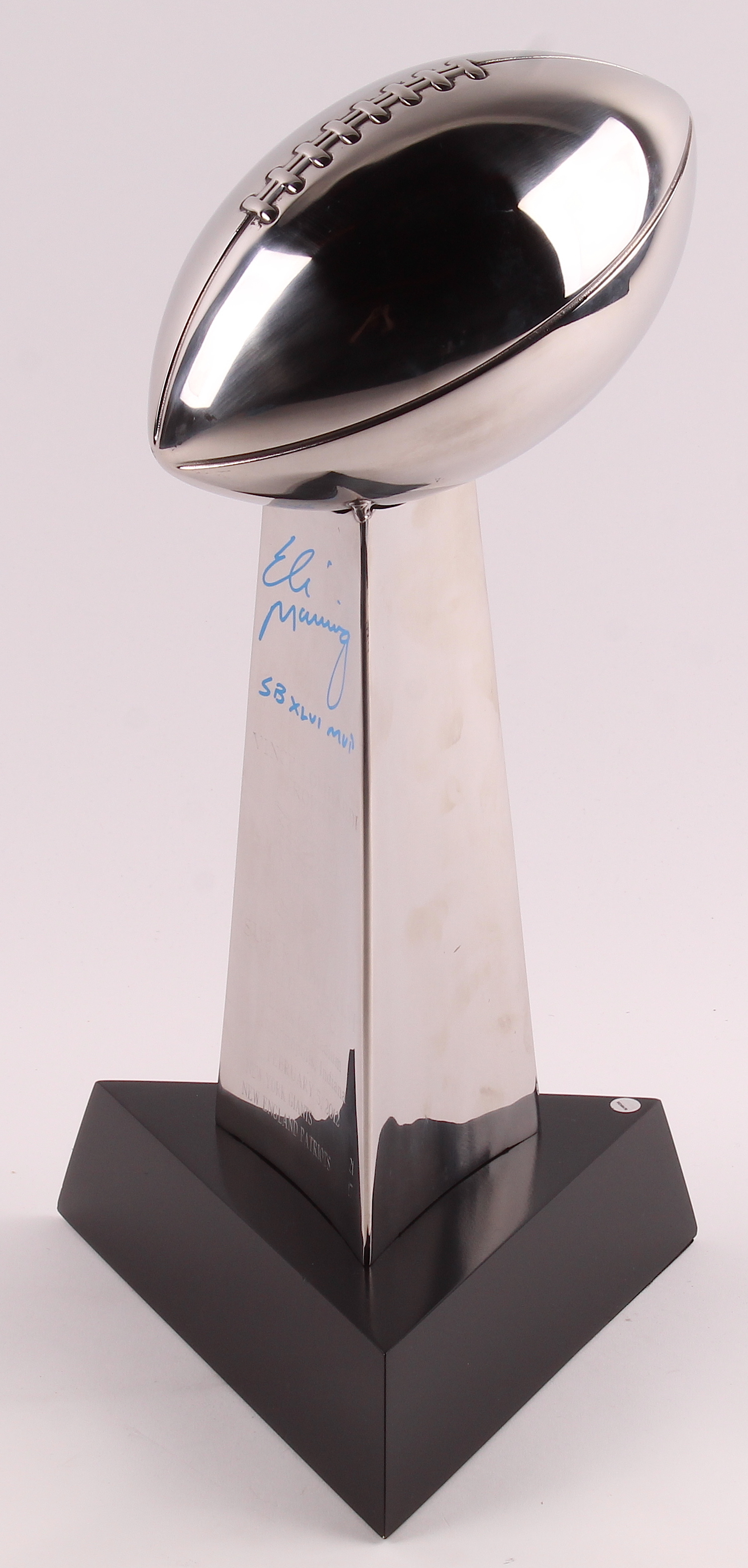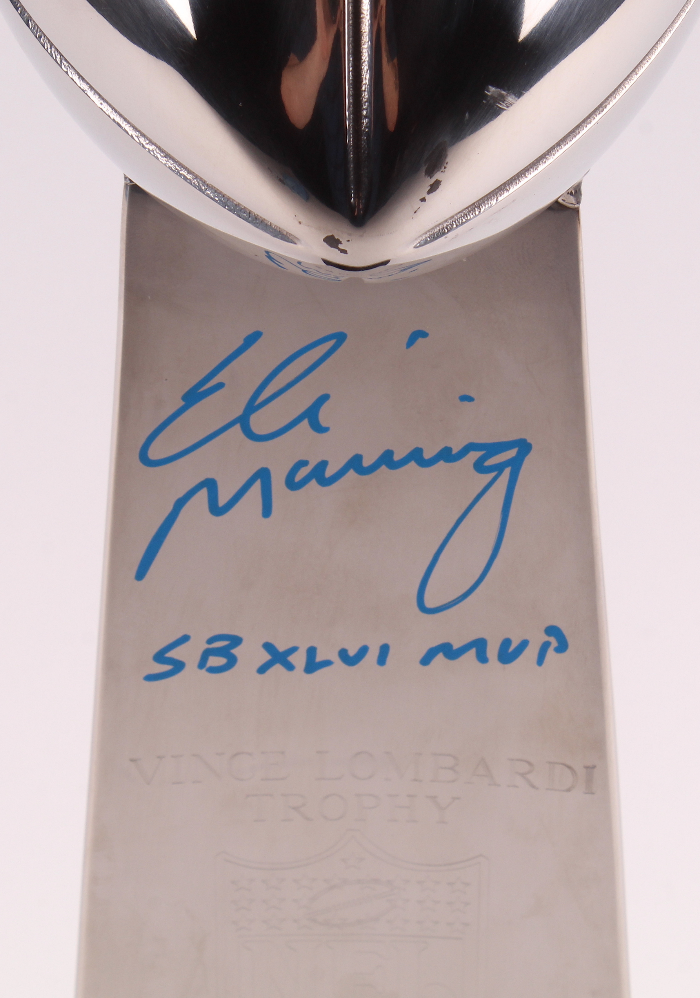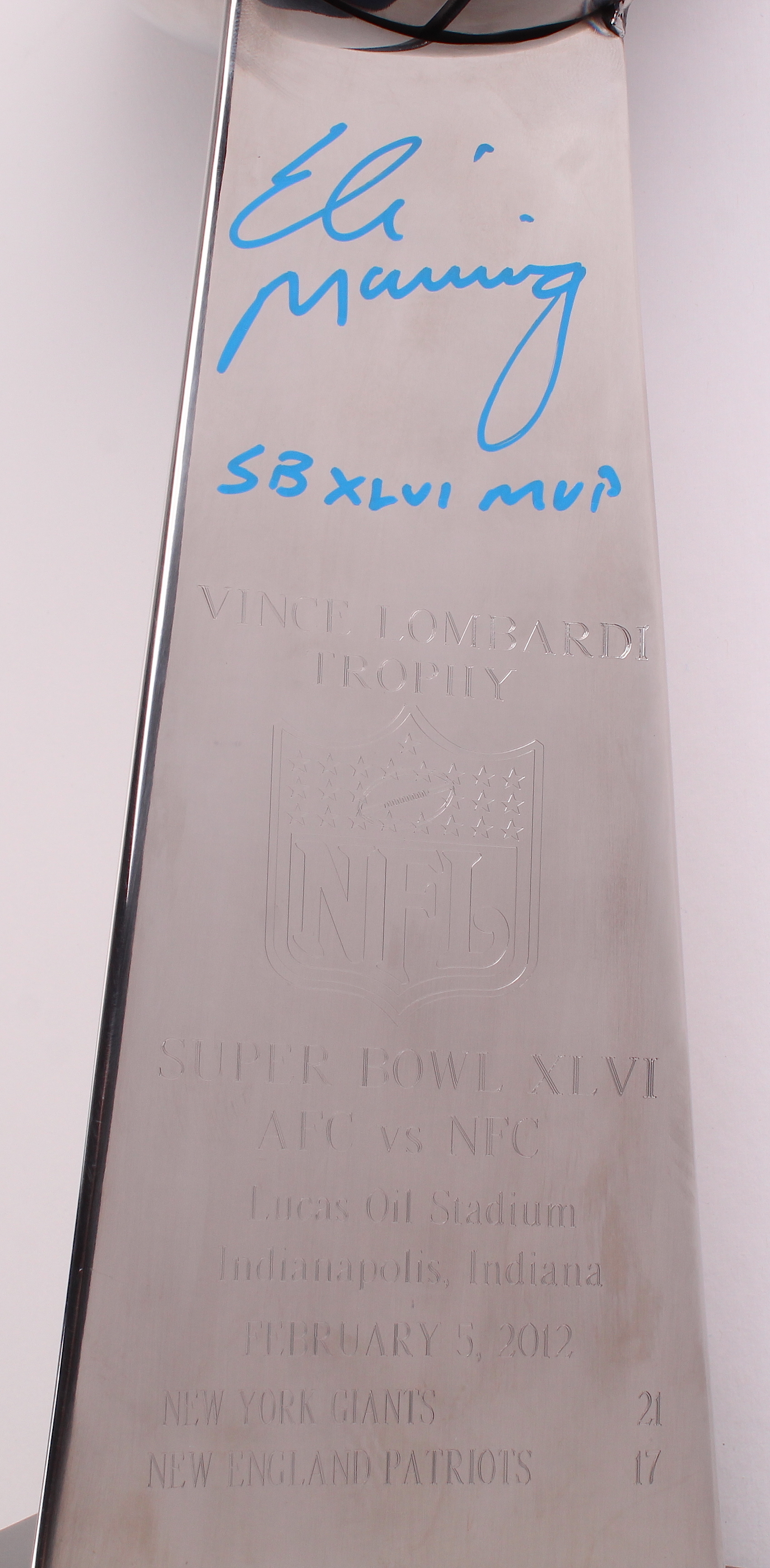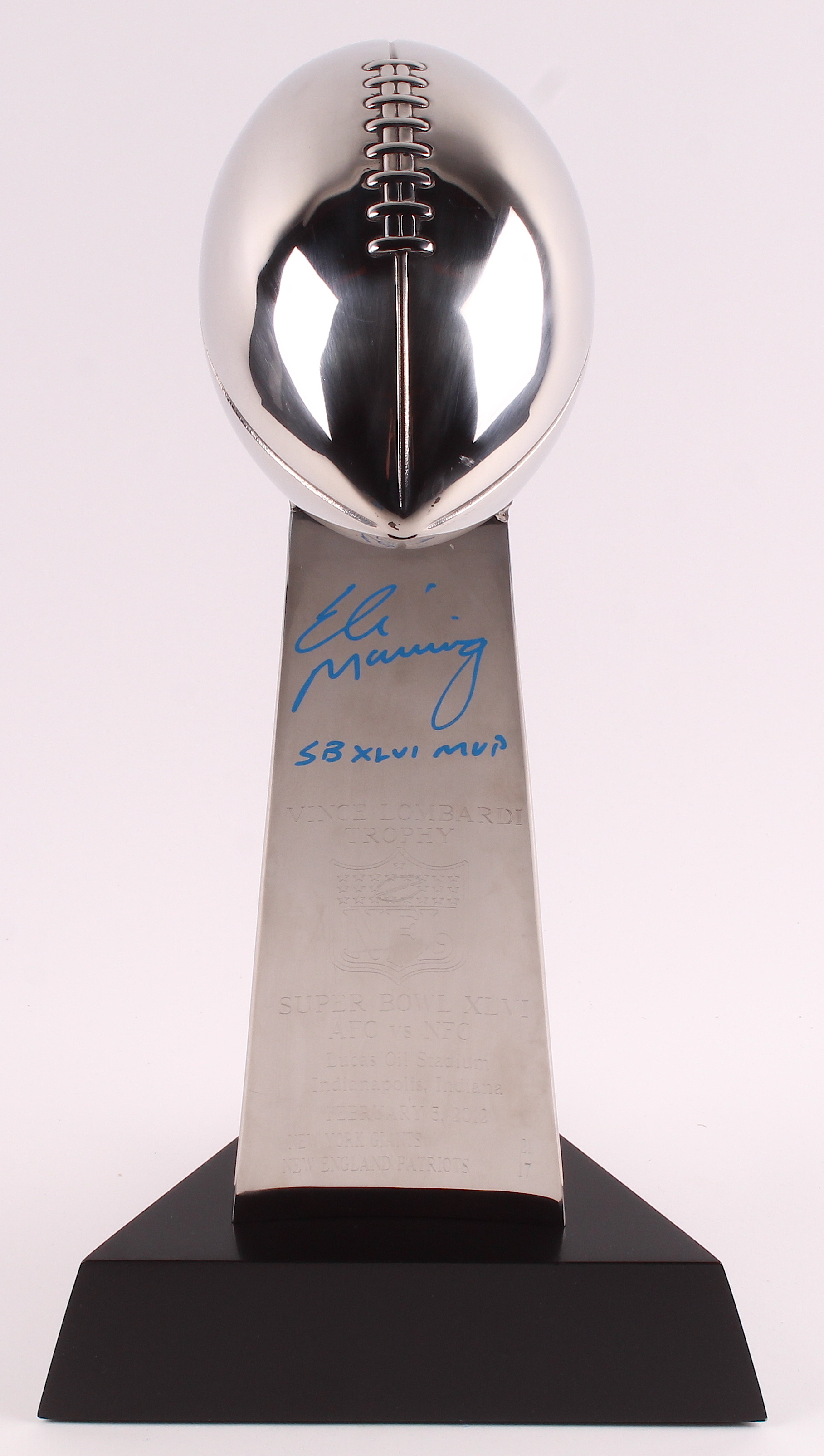 This high end, heavy replica Super Bowl XLVI Lombardi trophy measures approximately 17" in height. Hand-signed and inscribed in blue paint pen by Eli Manning (New York Giants).