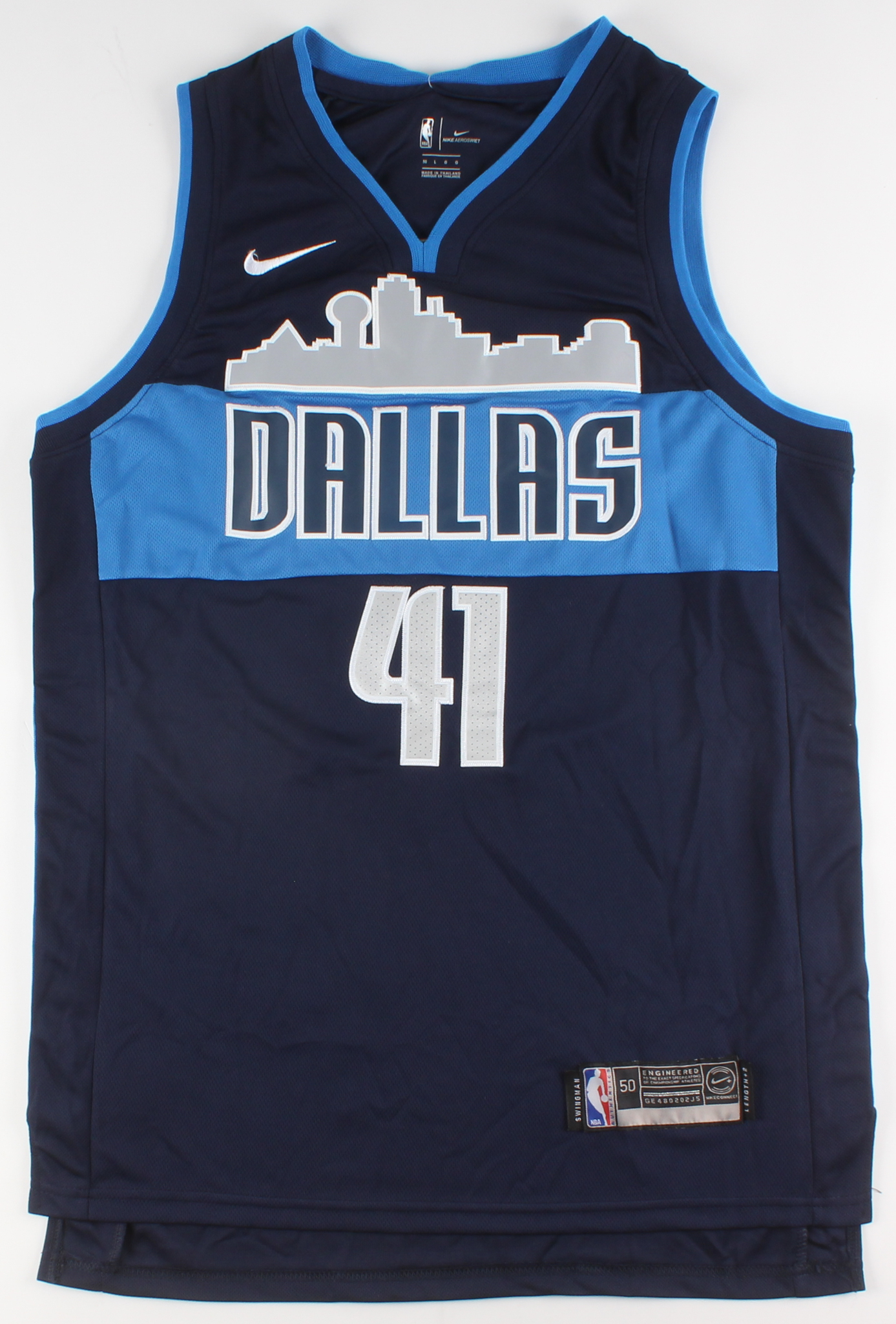 Nike on-court style jersey. Everything is sewn on, size 50. Jersey has been hand-signed in blue felt-tip pen by Dirk Nowitzki.