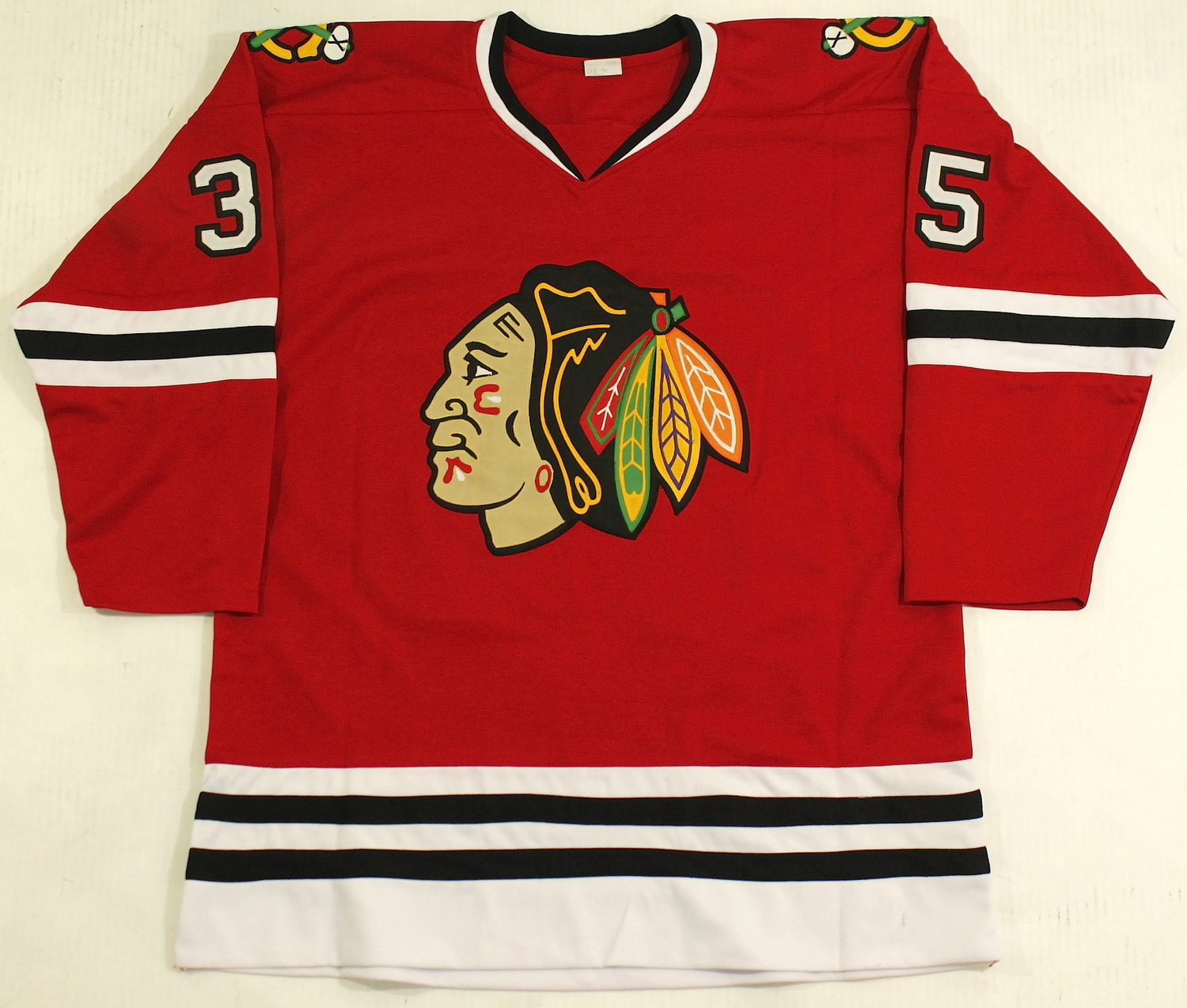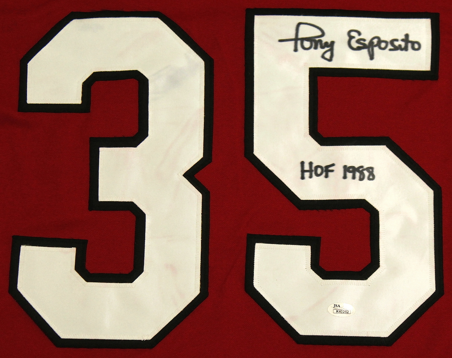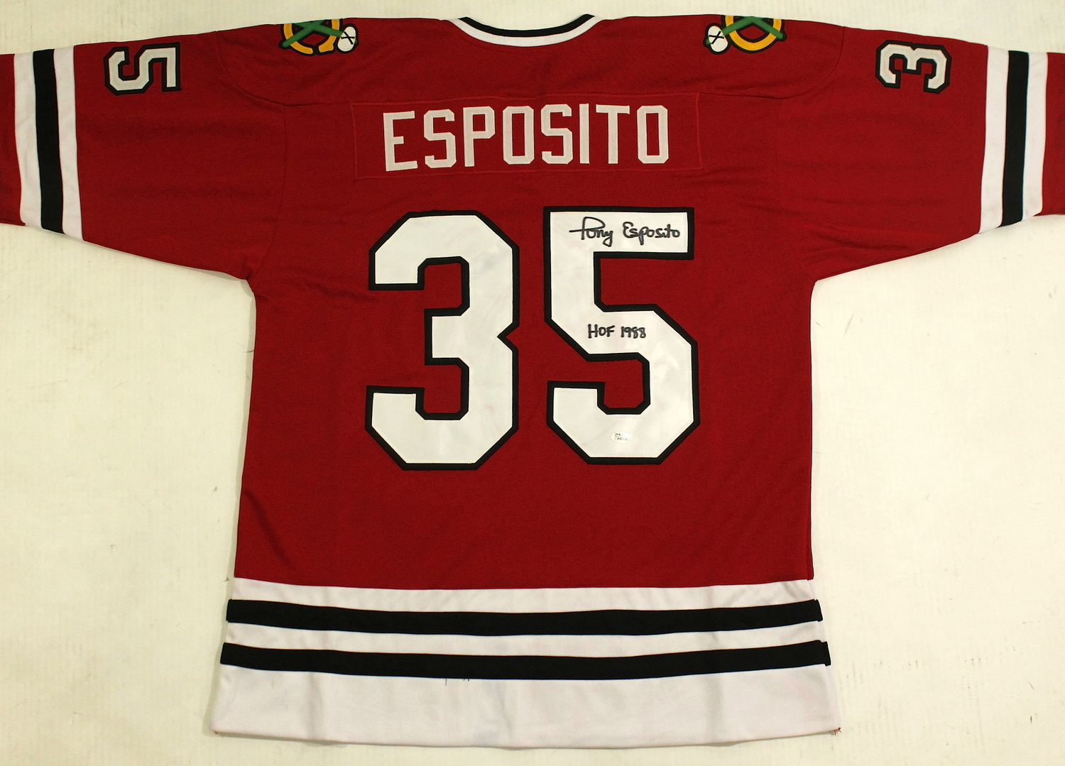 Custom on-ice style jersey. Everything is sewn on, size XL. Hand-signed and inscribed in black felt tip pen by Tony Esposito (Blackhawks, HOF). The autograph includes an official James Spence Authentication (JSA) hologram and matching COA for authenticity purposes.