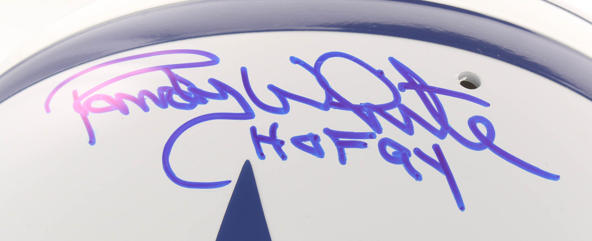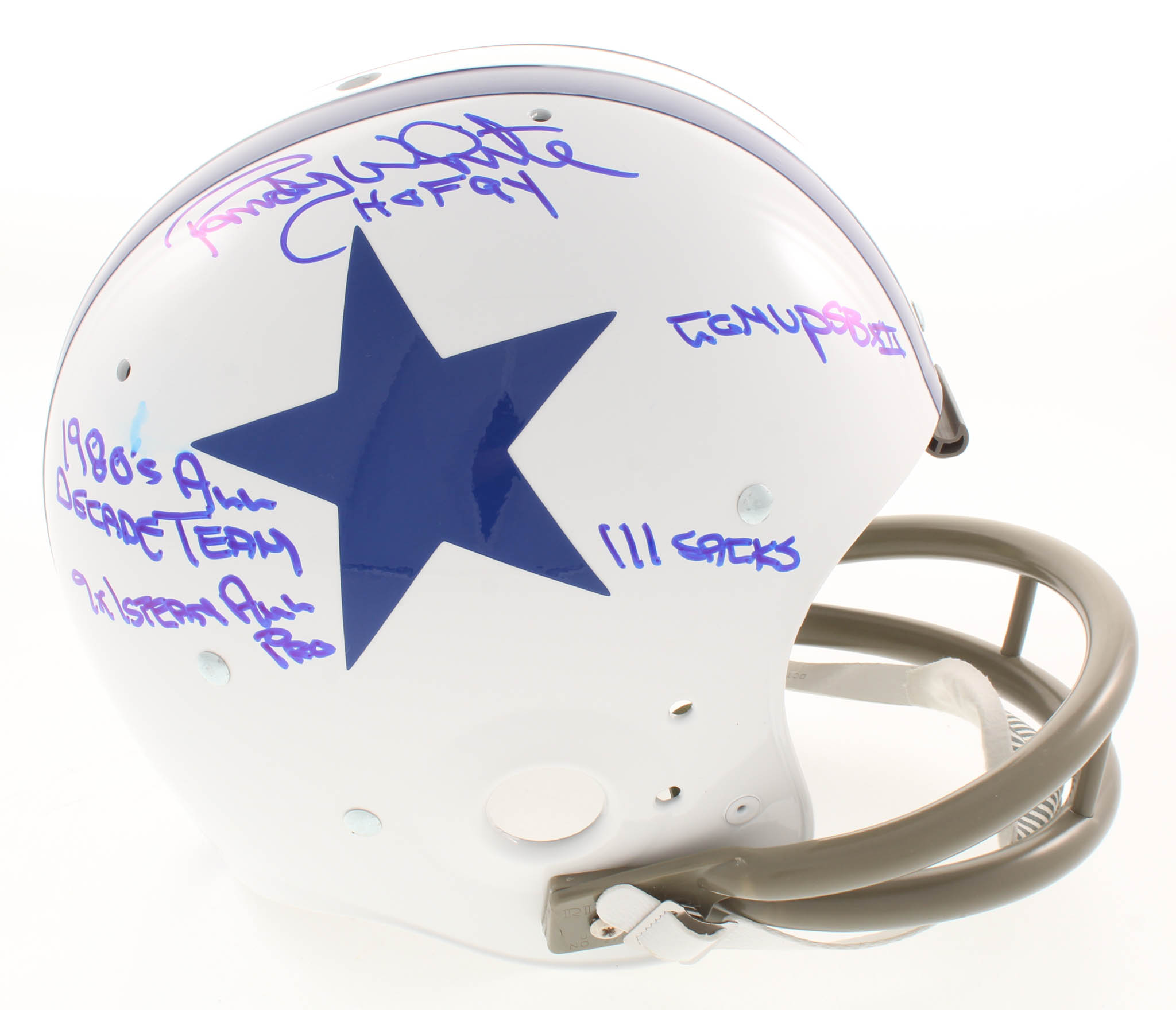 Dallas Cowboys throwback authentic suspension full-size helmet. Hand-signed in blue felt-tip pen by Randy White (HOF).