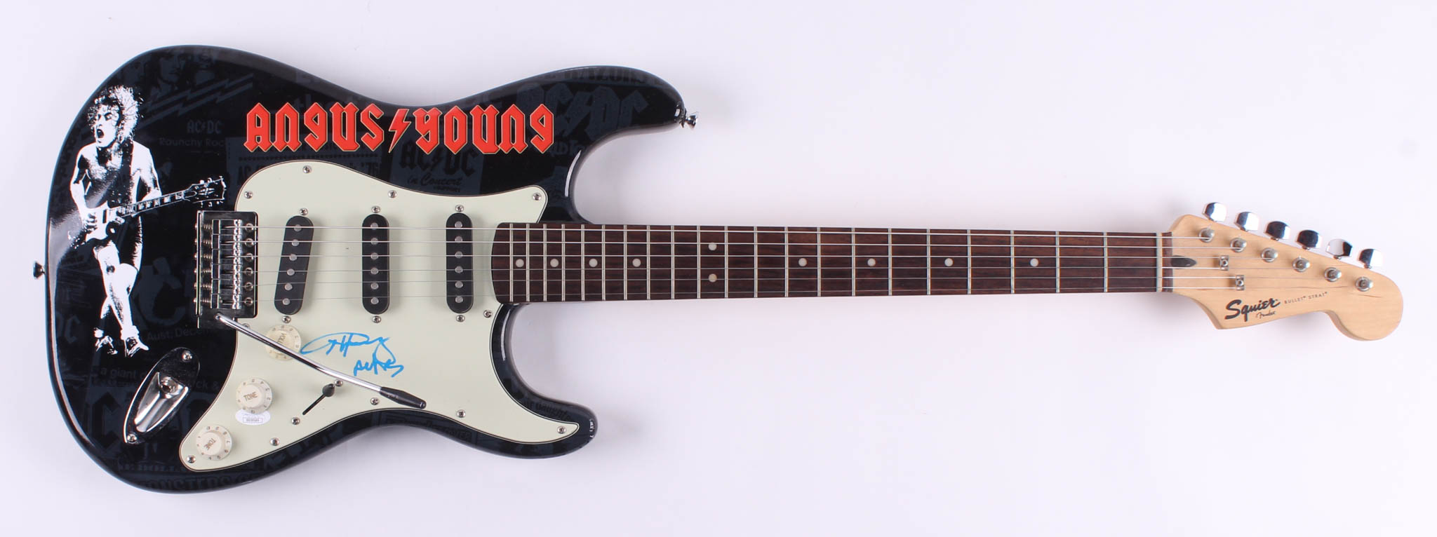 Fender Squier 39" electric guitar has been hand-signed in blue felt-tip pen by Angus Young.