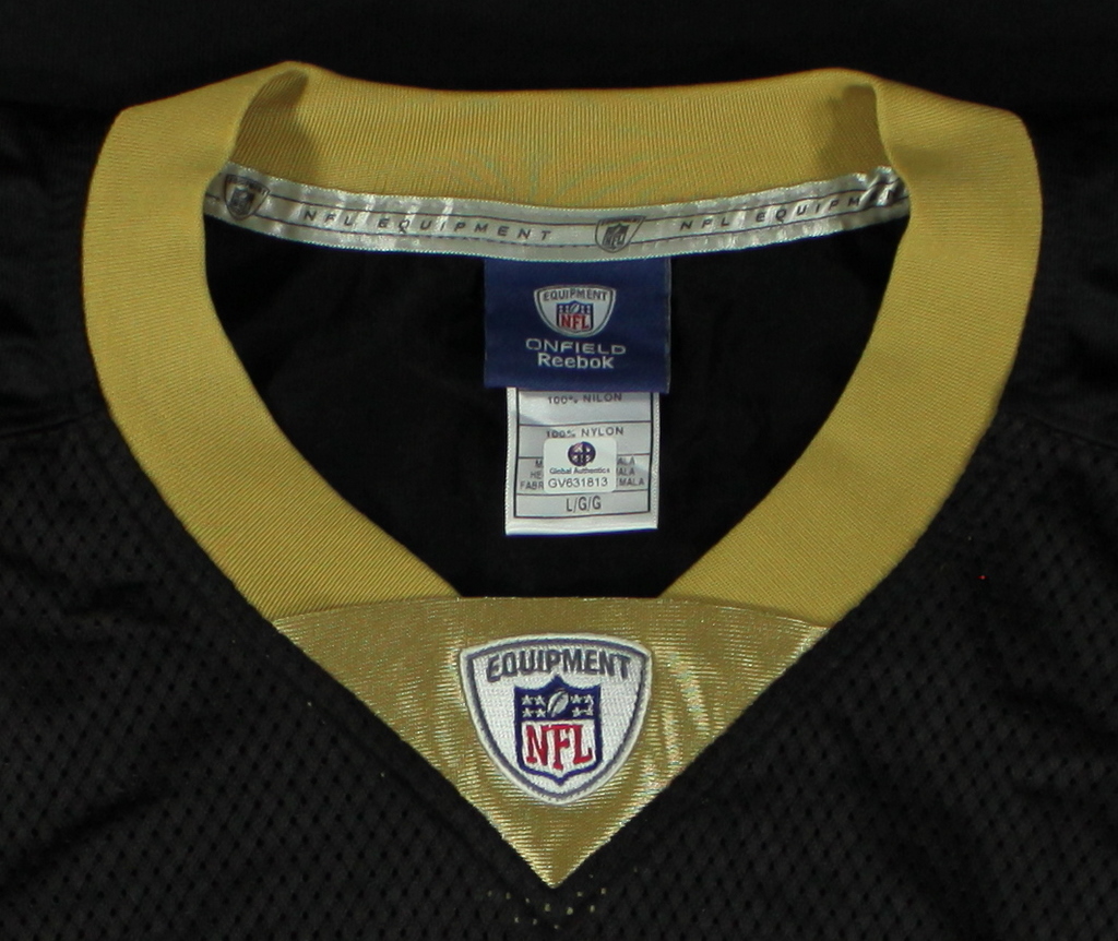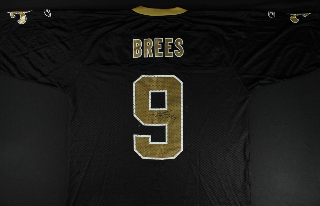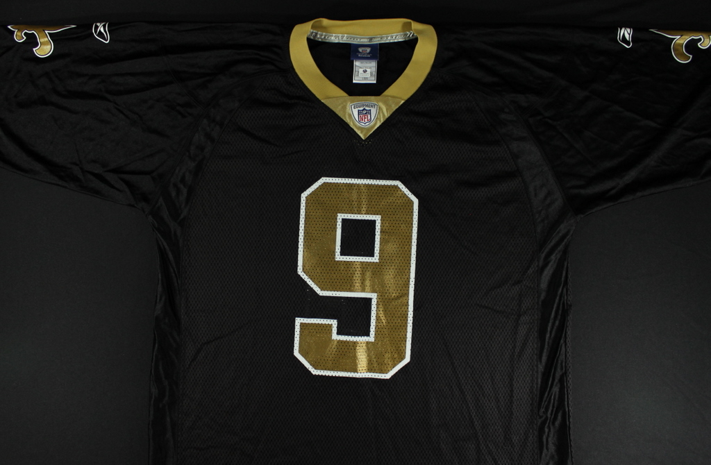 Reebok replica jersey, size L. Hand-signed in black felt tip pen by Drew Brees. The autograph includes a Global Authentics (GA) hologram for authenticity purposes.