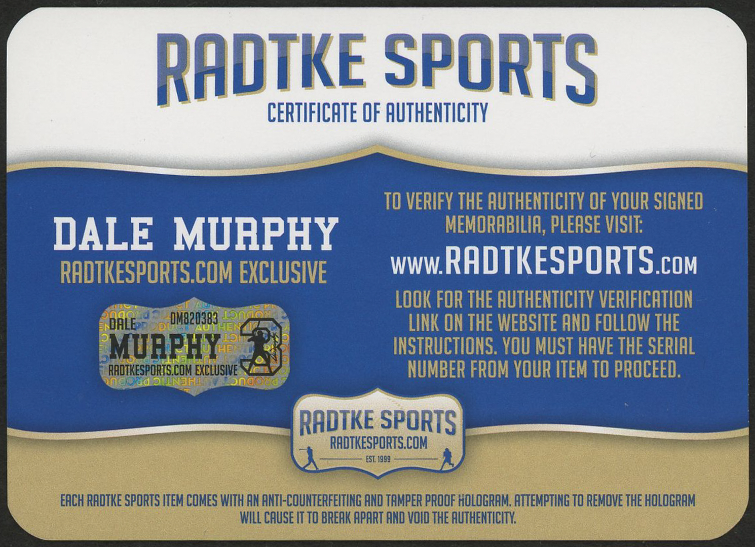 The lot / autograph(s) includes an official exclusive Dale Murphy hologram and COA from Radtke Sports.