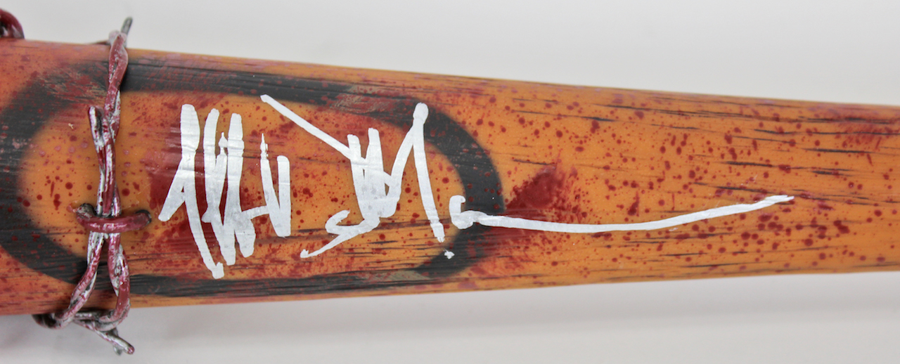 McFarlane Toys barbed wire baseball bat replica measures 32" in length and has been hand-signed in silver paint pen by Jeffrey Dean Morgan (Negan). The bat is made of a dense plastic/foam material, and the barbed wire is made of a soft plastic made to look like metal.