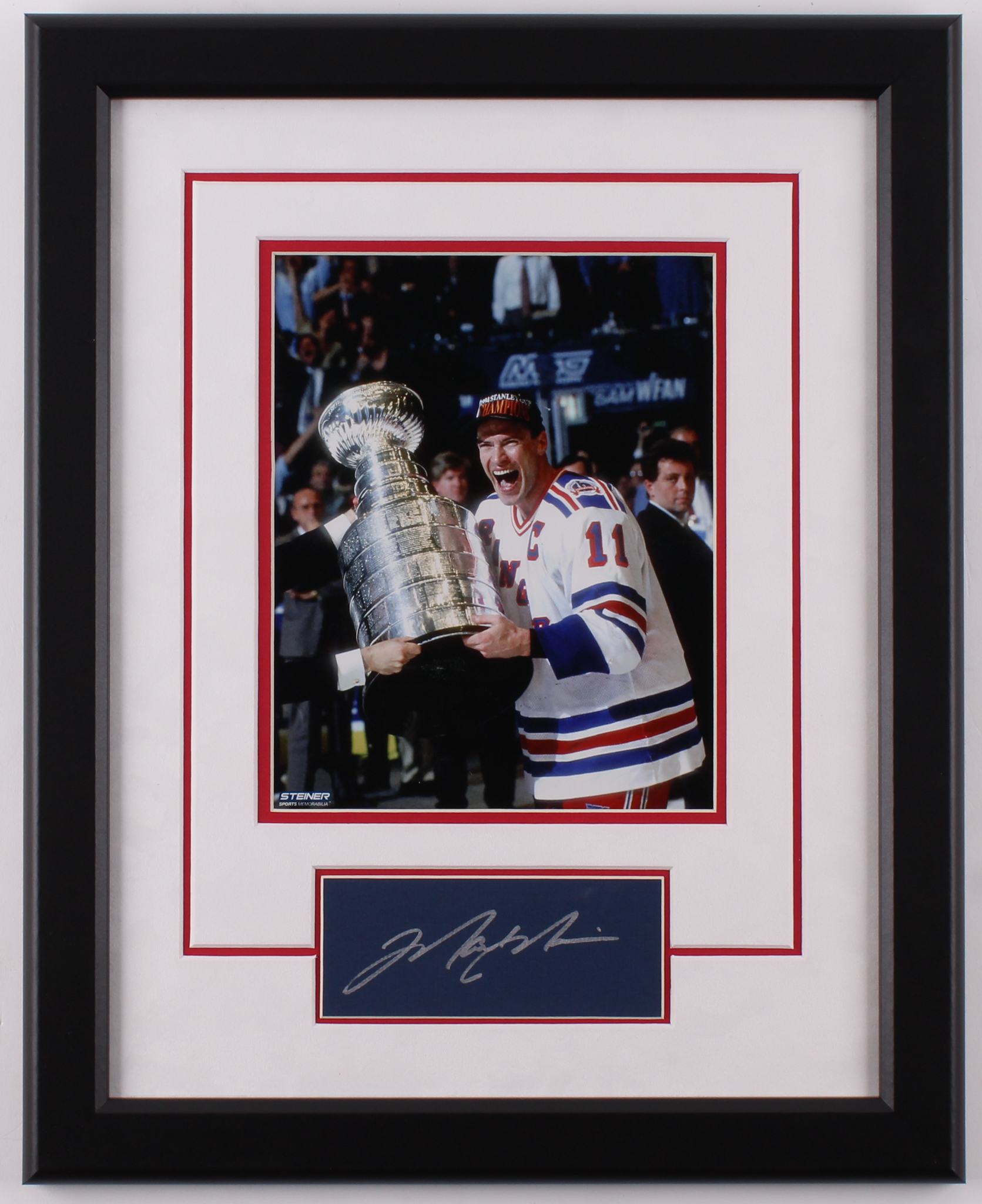 Custom framed cut display measures 16.5" x 20.5" in size and has been hand-signed in silver paint pen by Mark Messier. (HOF)