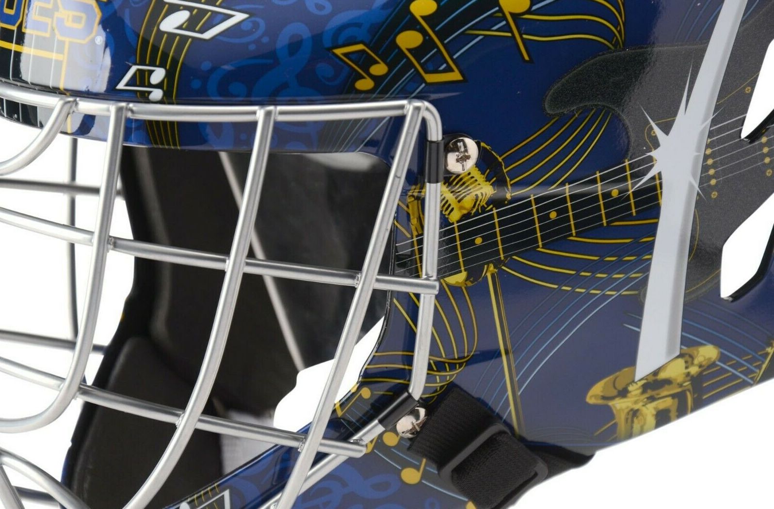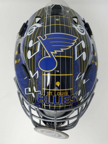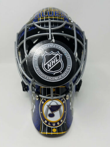 Franklin St. Louis Blues full-size goalie mask. Hand-signed and inscribed in blue paint pen by Jordan Binnington. Please note, the mask is limited edition and has been hand-numbered #/50.