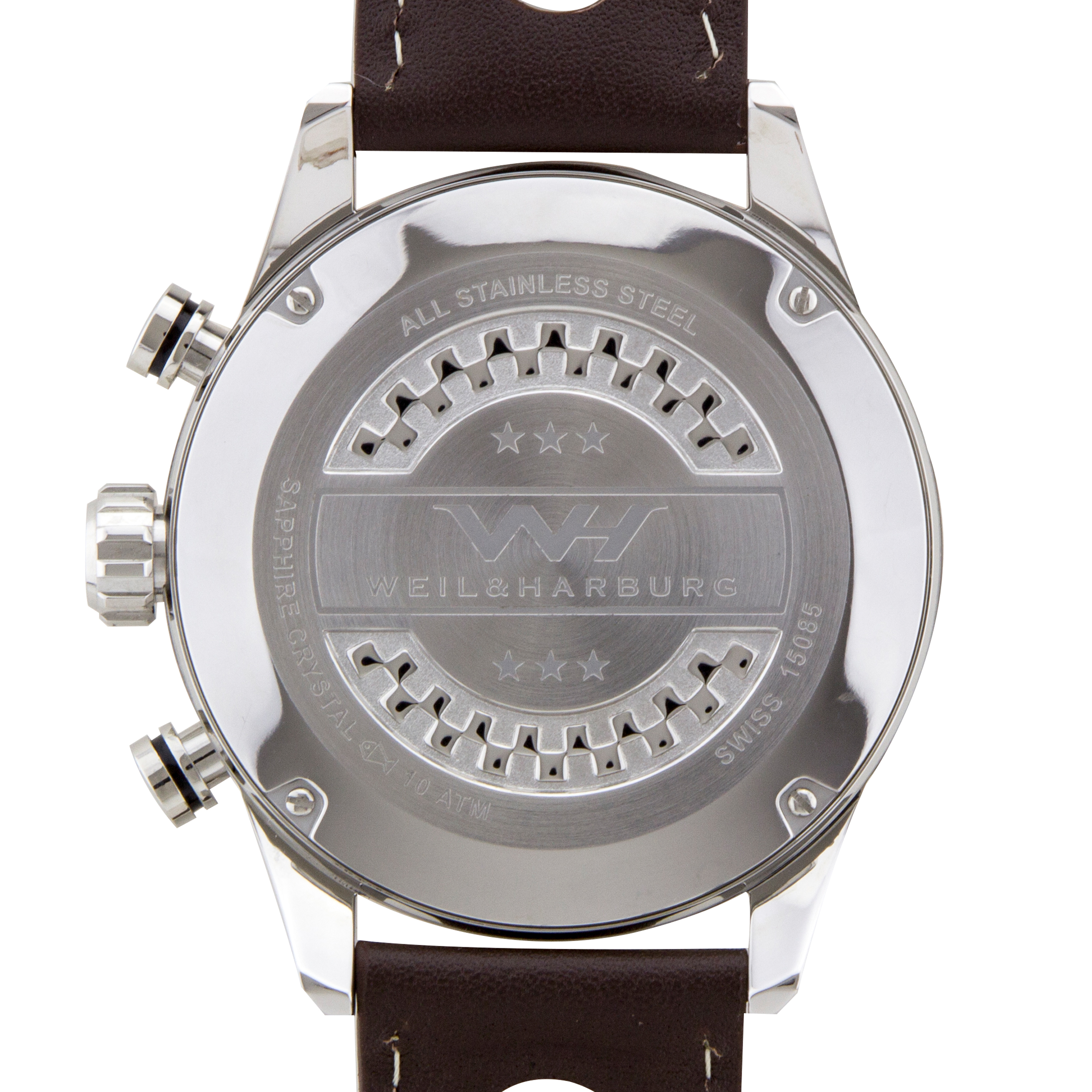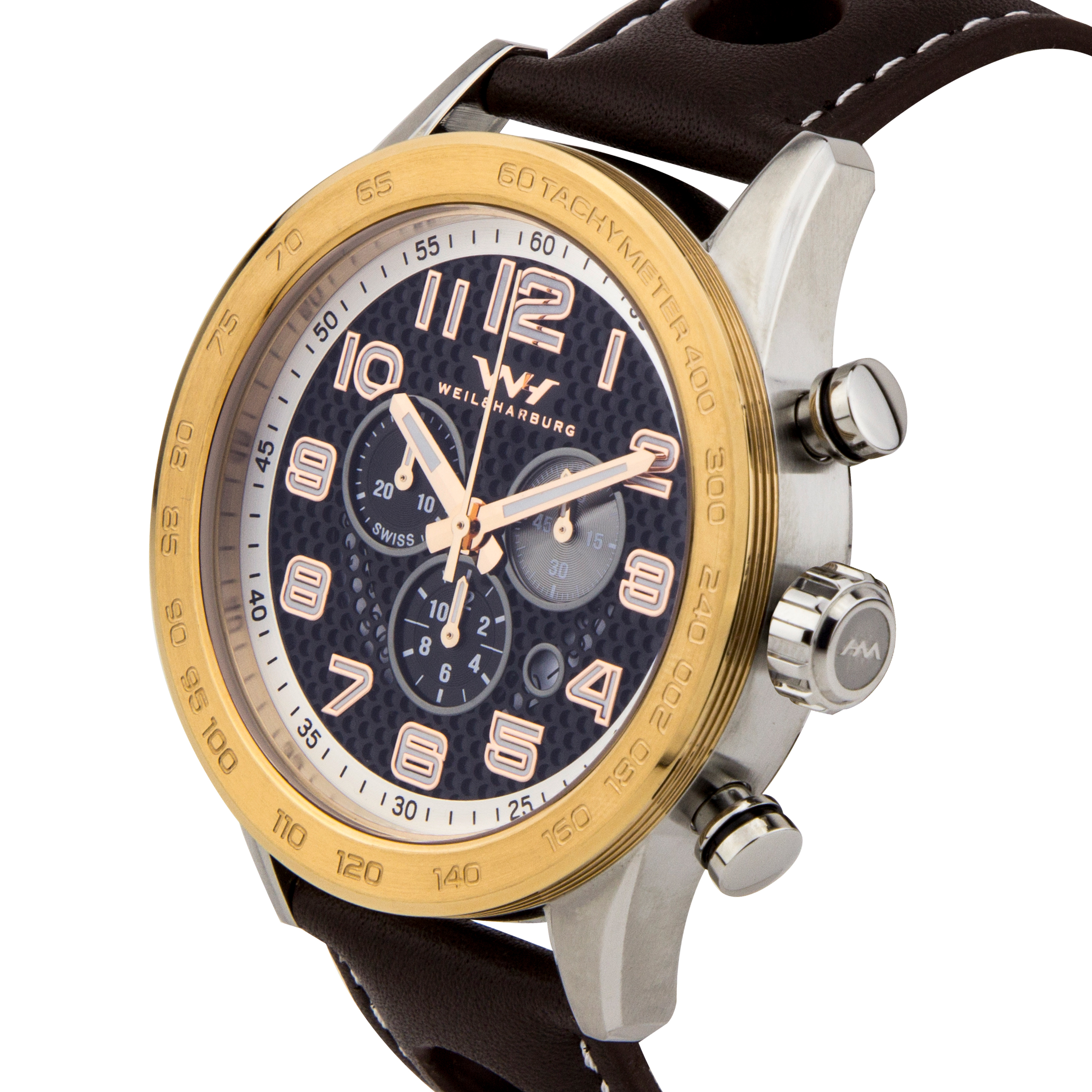 The Weil & Harburg Karkin Men's Chronograph Watch features a brown leather strap, black dial, silver case, and rose gold bezel. Please see photos for details.