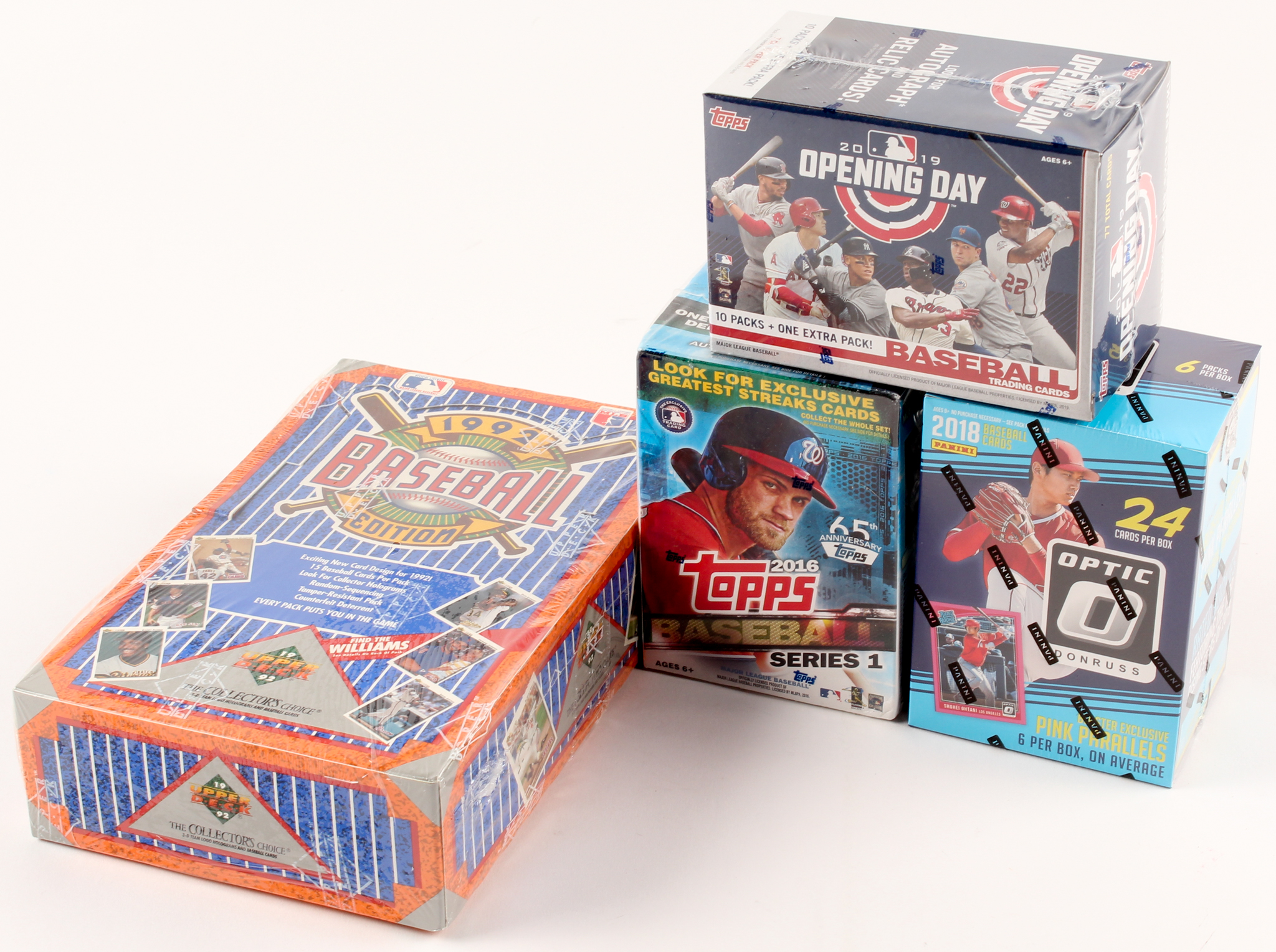 Lot of (4) Unopened Card Sets with 1992 Upper Deck Baseball Box, 2018 Panini Donruss Optic Baseball Blaster Box, 2016 Topps Baseball Series 1 Box & 2019 Topps Opening Day Baseball Box