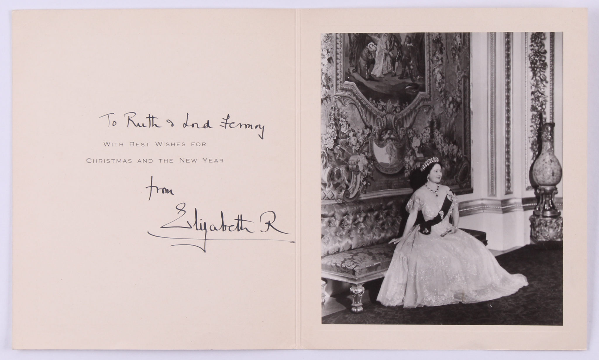 Christmas Card Photo Folder measures 6.75" x 13.5" in size and has been hand-signed in black ink pen by Queen Elizabeth The Queen Mother (D. 2002). Please note the item has been personalized Ruth and (1) other.
