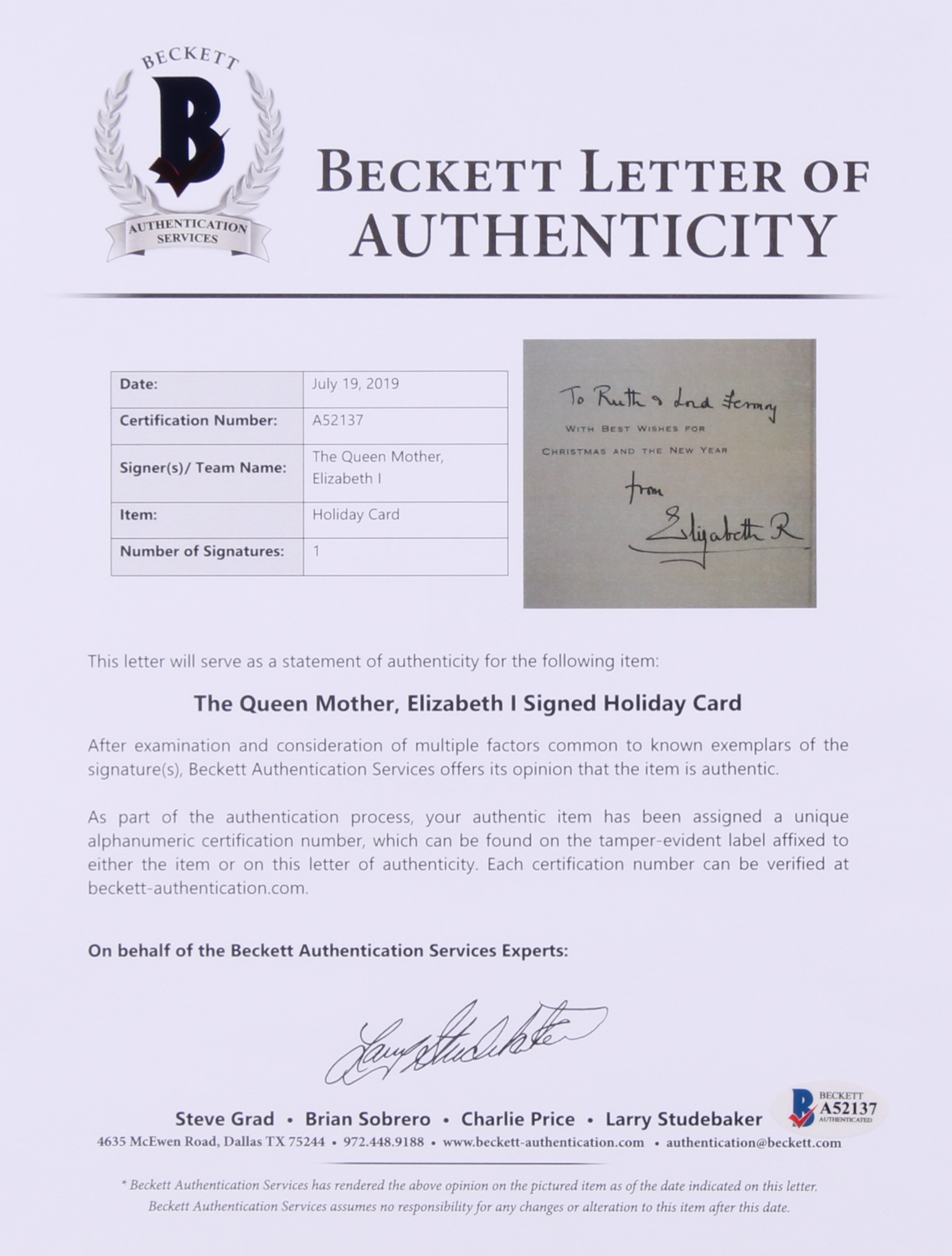 Queen Elizabeth I, The Queen Mother Signed Christmas Card Photo Folder (Beckett LOA)