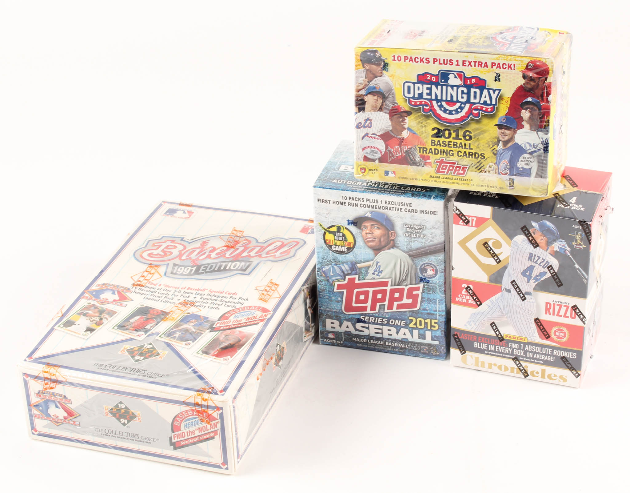 Lot of (4) Card Box Sets with 2016 Topps Opening Day Baseball Box, 1991 Upper Deck Baseball Box, 2015 Topps Series One Baseball Box, & 2017 Panini Chronicles Baseball Box