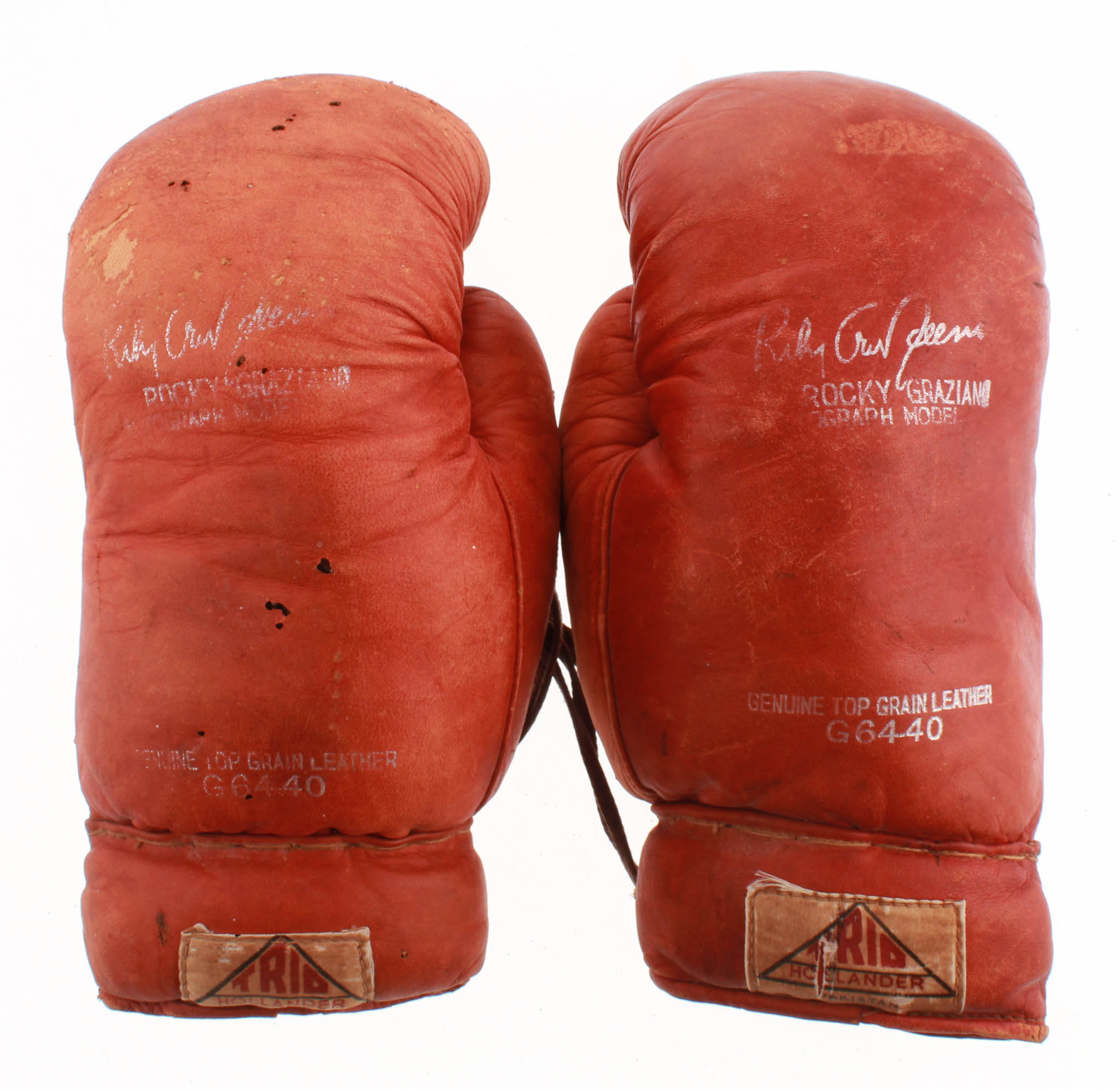 Lot includes (1) pair of Trio Hollander genuine top-grain leather boxing gloves with Rocky Graziano signature facsimile engravements on each glove. Please note that the item is not hand-signed.