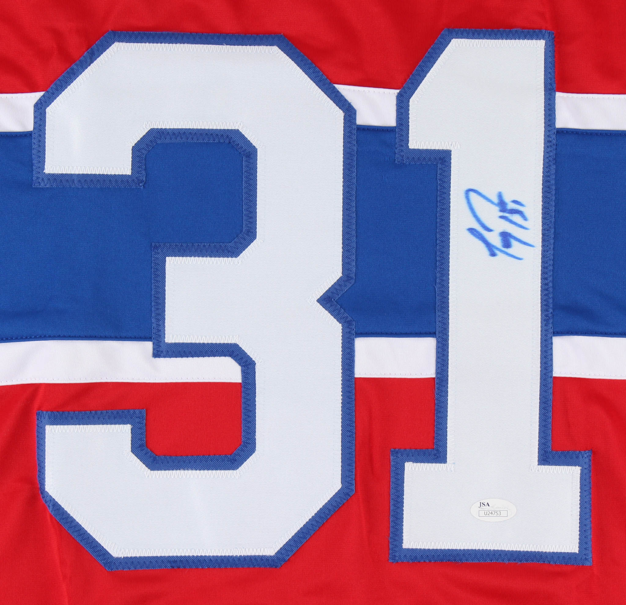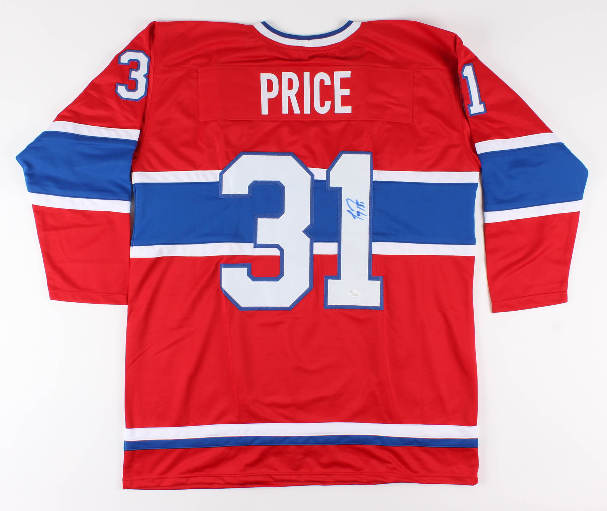 Custom on-ice style jersey. Everything is sewn on, size XL. Hand-signed in blue felt-tip pen by Carey Price.