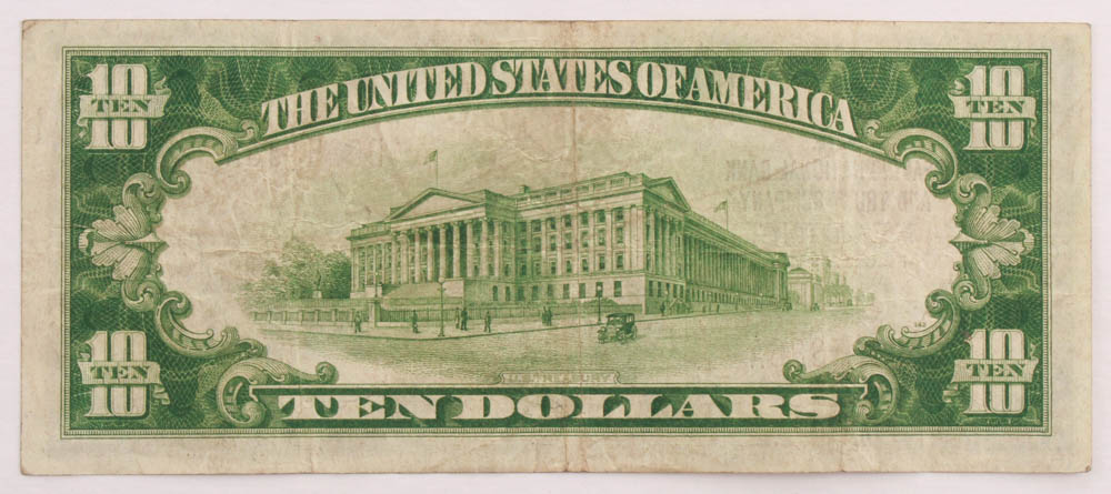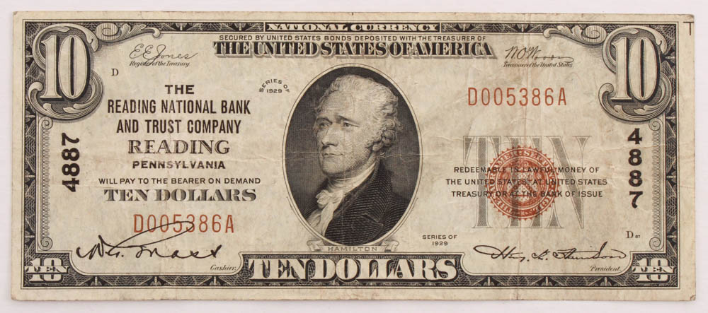 1929 $10 Ten-Dollar U.S. National Currency Bank Note with Brown Seal (The Reading National Bank & Trust Company of Reading, Pennsylvania)