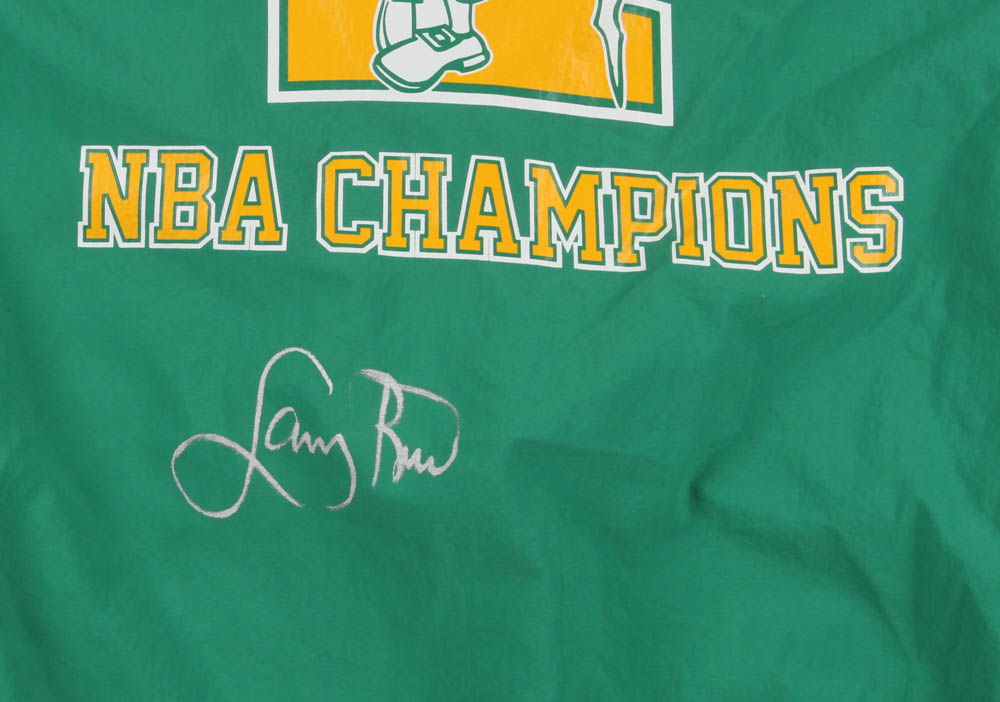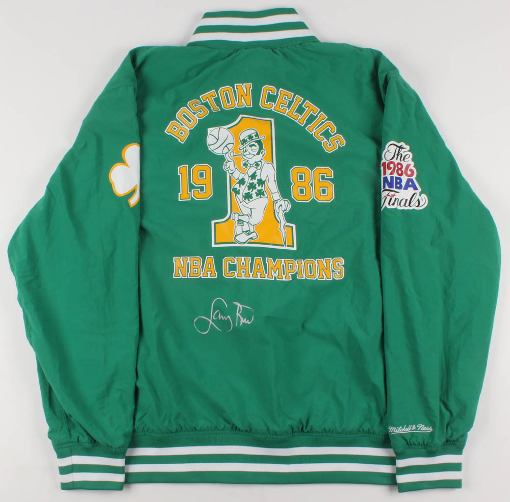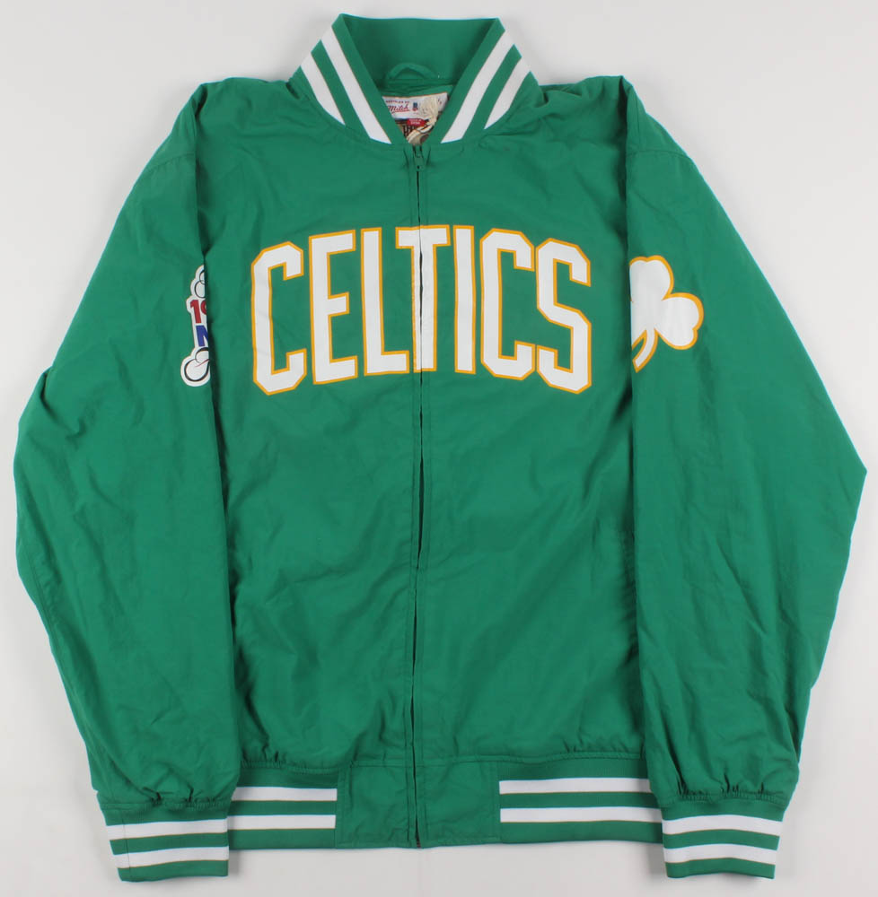 Mitchell & Ness on-court style warm-up jacket. Everything is screened on, size XL. Hand-signed in silver paint pen by Larry Bird (HOF).