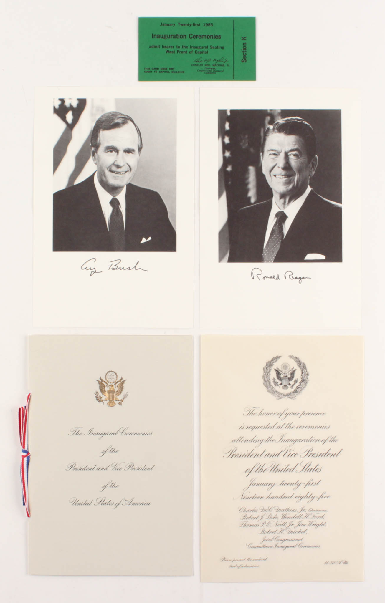 Lot of (5) 1985 Ronald Reagan & George H.W. Bush Inauguration Items with Ceremony Program, Invitation, Ticket,& (2) Photos