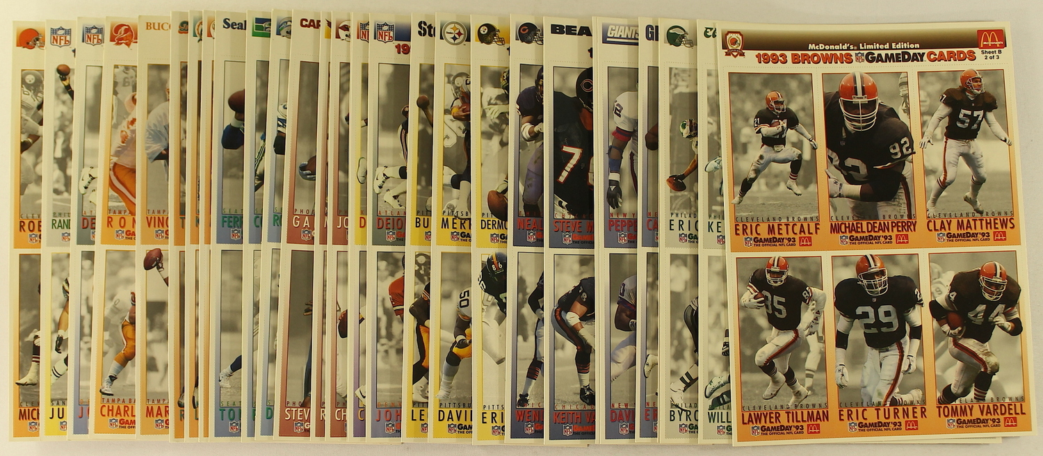 Lot of (32) Sheets 1993 McDonald's LE NFL Gameday Cards With Irving Fryar, Howie Long, Jerry Rice, Jerry Hill, Jeff Graham, & Others