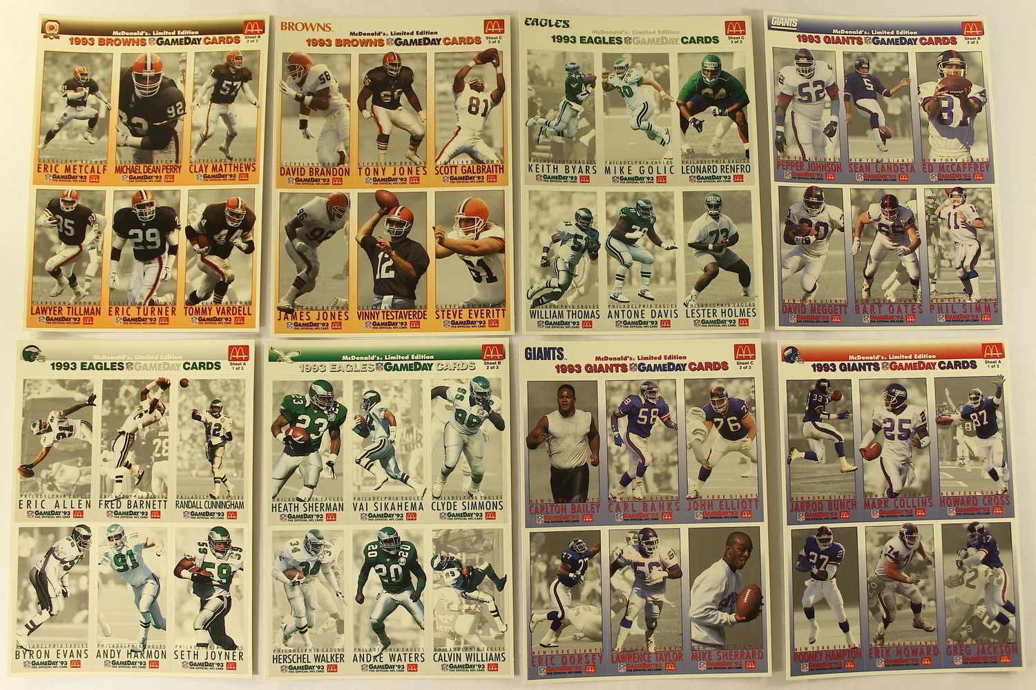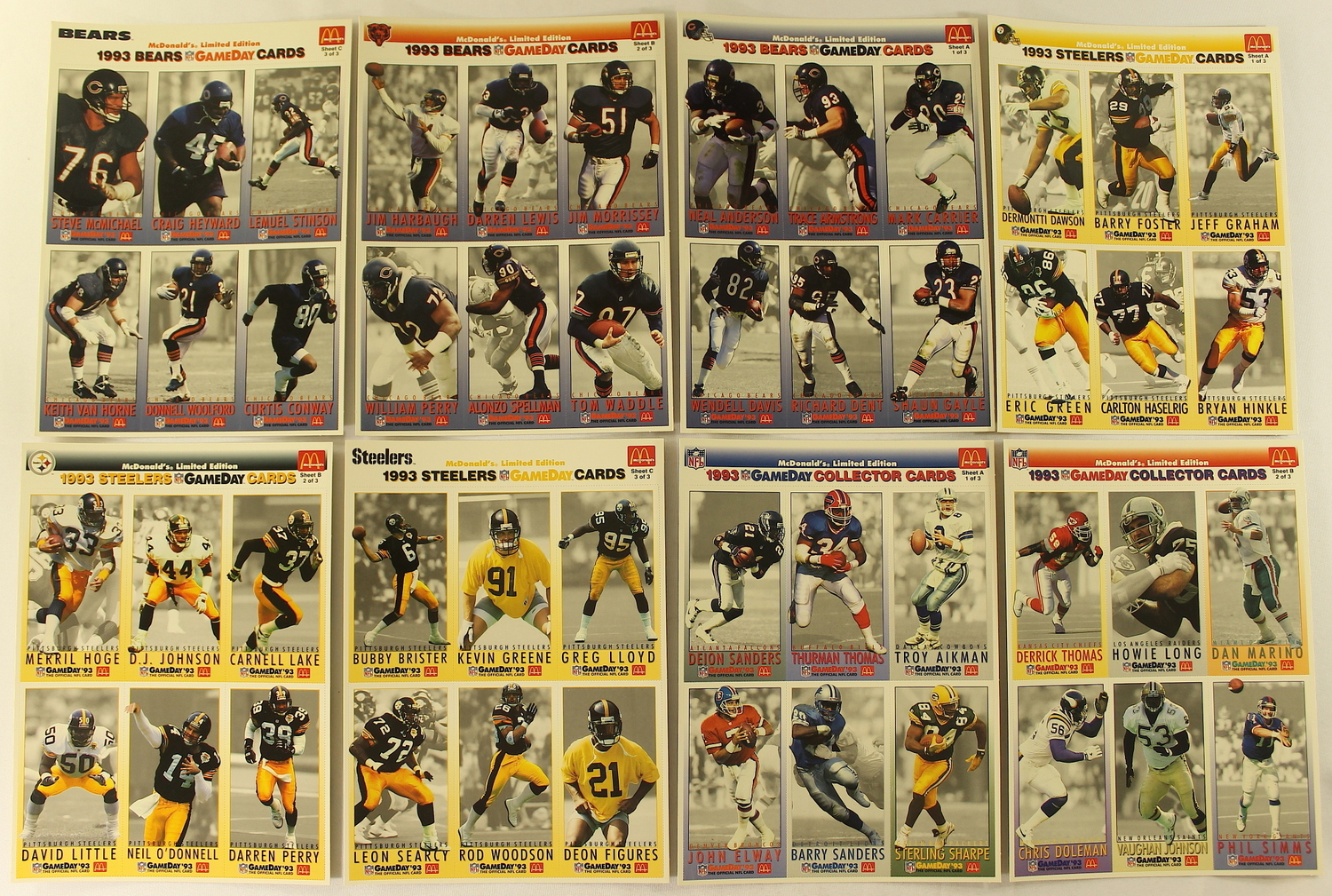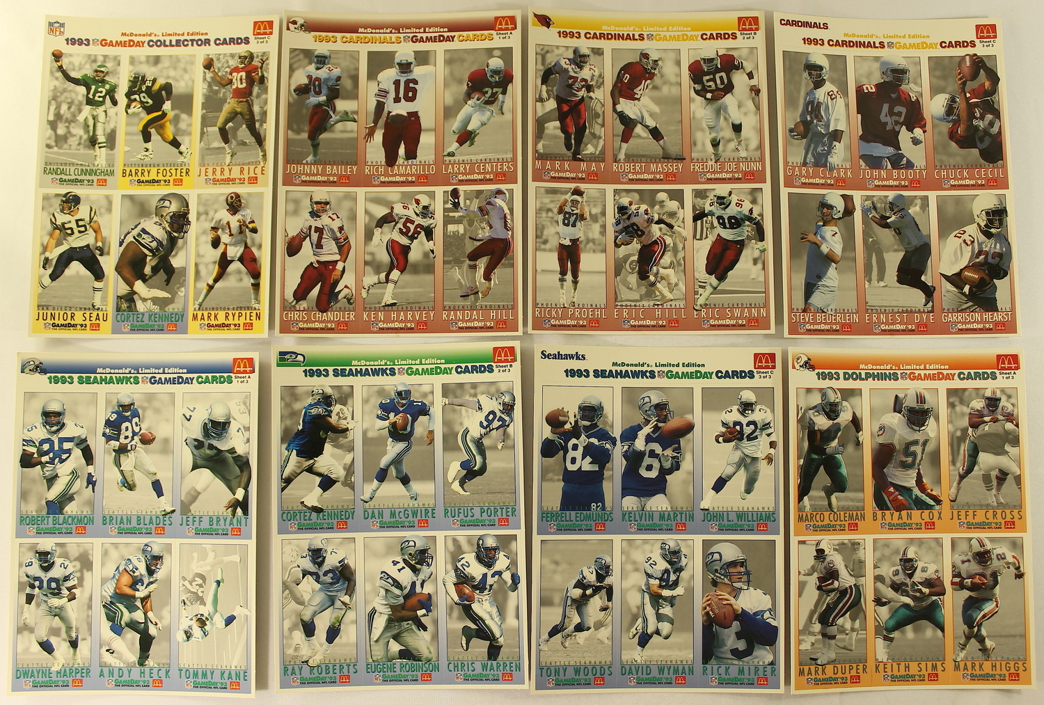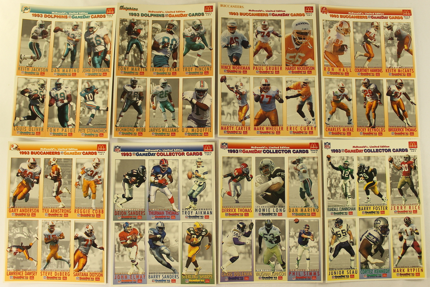 Lot of (32) sheets 1993 McDonald's NFL Gameday Cards with Irving Fryar (Dolphins), Howie Long (Raiders), Jerry Rice (49ers), Eric Hill (Cardinals), Jeff Graham (Steelers), Deion Sanders (Falcons), Greg Jackson (Giants), Heath Sherman (Eagles), and others. Please see photos.