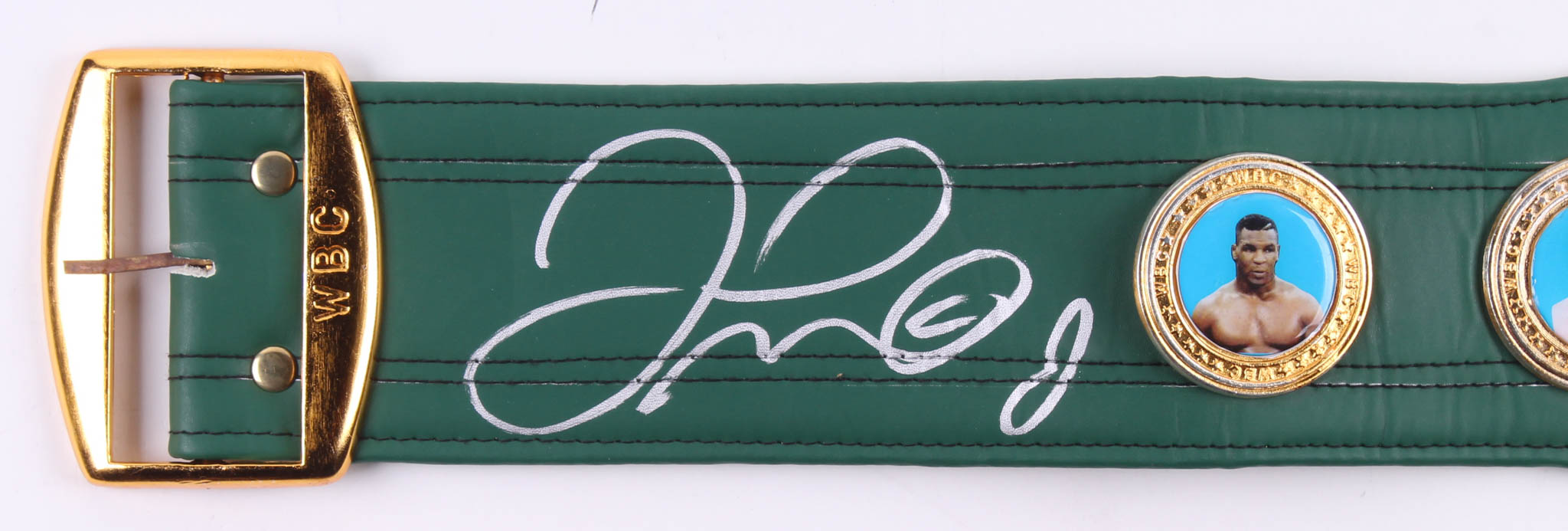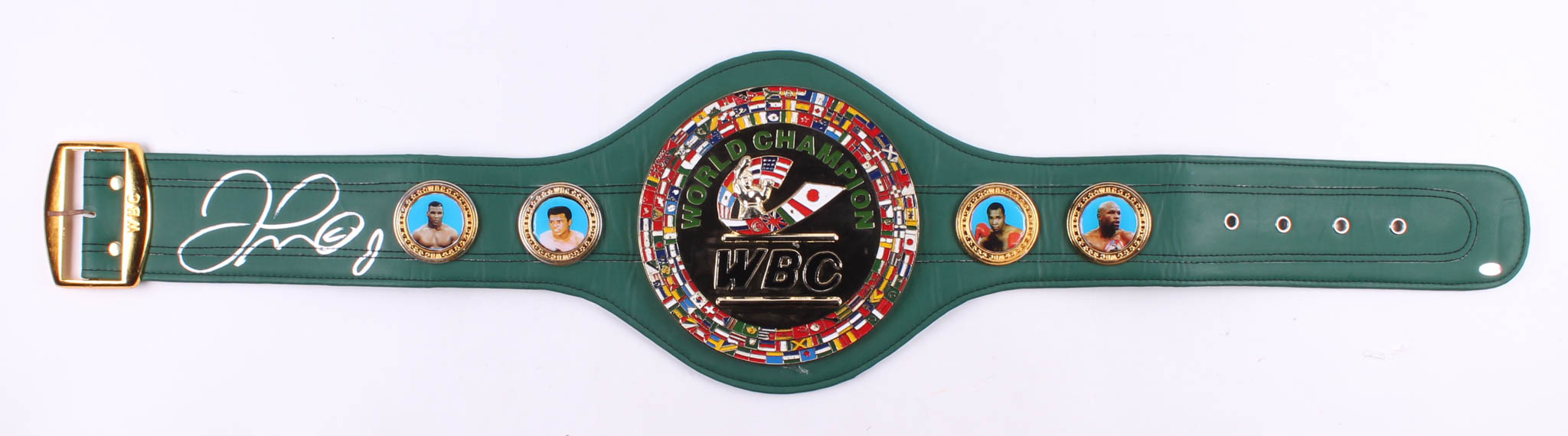 Full-size replica WBC Heavyweight Championship belt. The belt has been hand-signed in silver paint pen by Floyd Mayweather Jr. The belt includes thick metal plates and faux leather.