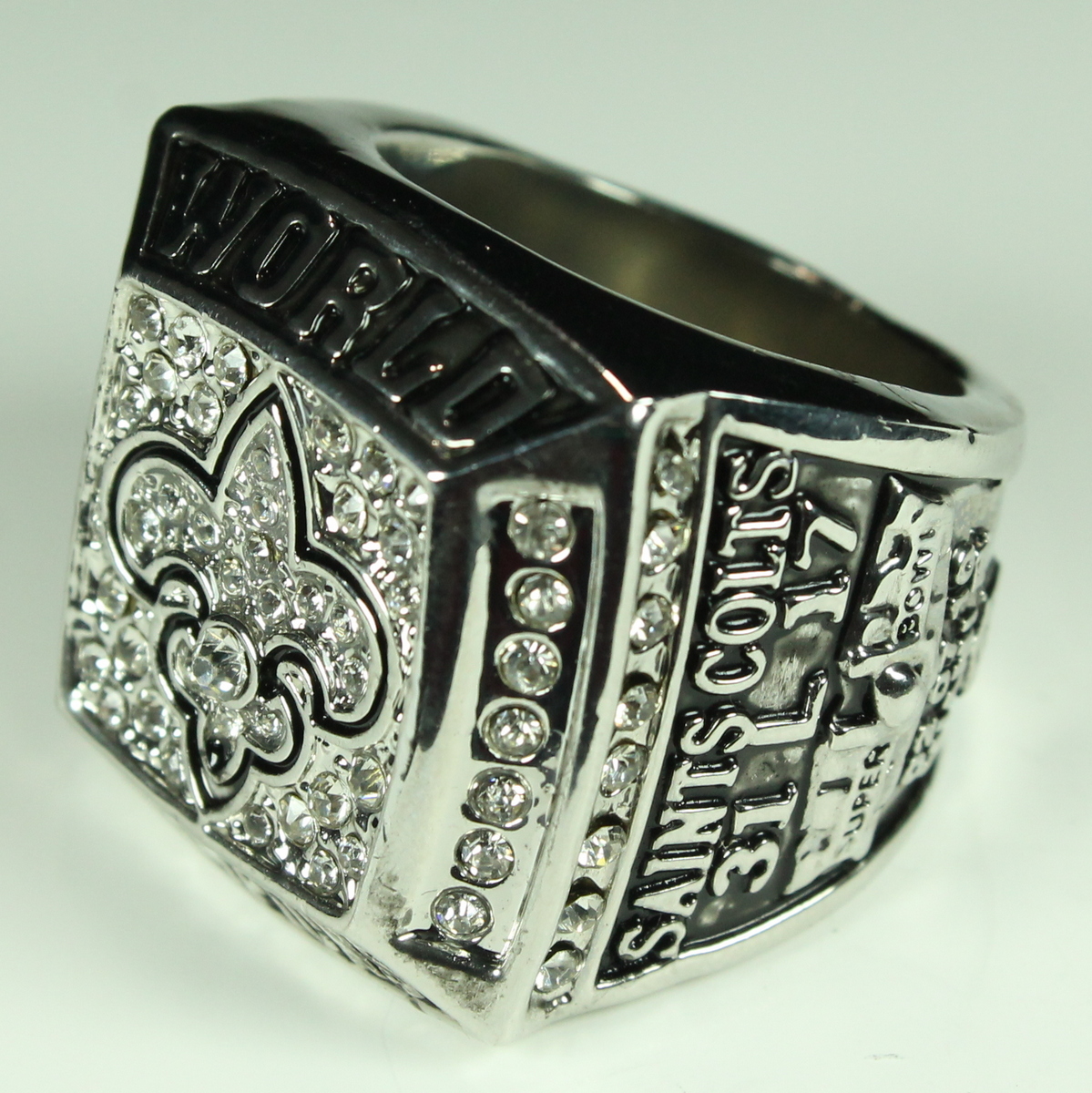 Drew Brees New Orleans Saints High Quality Replica 2010 Super Bowl XLIV Champions Ring. The ring has been hand crafted by professional jewelers. Made of brass and clad with silver. Size 11.