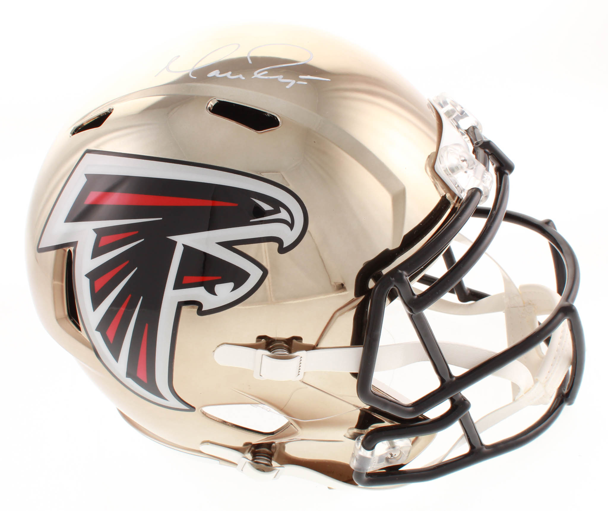 Riddell Atlanta Falcons full-size replica chrome speed helmet. Hand-signed in white paint pen by Matt Ryan.