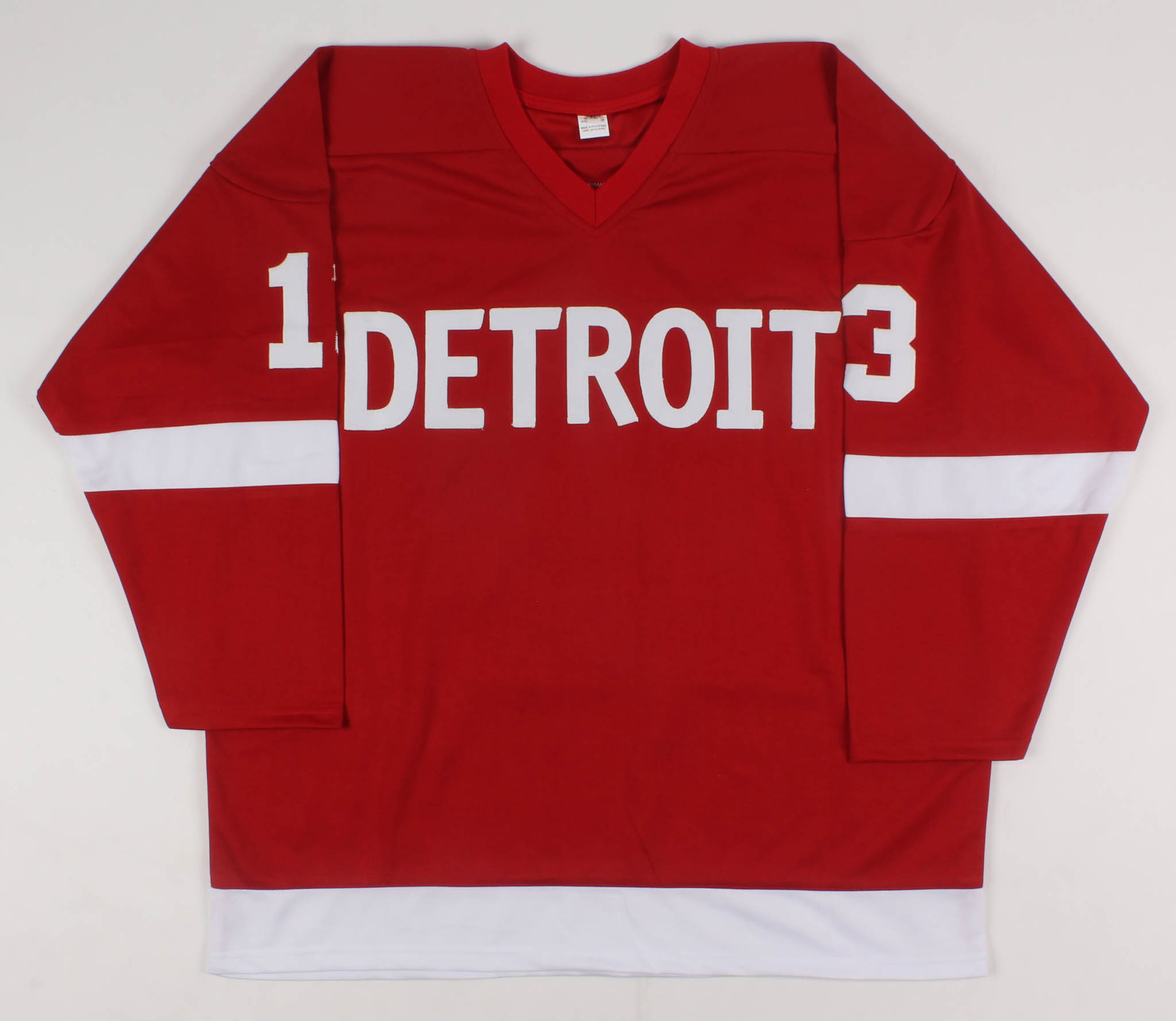 Custom on-ice style jersey. Everything is sewn on, size XL. Has been hand-signed and inscribed in blue felt-tip pen by Pavel Datsyuk.